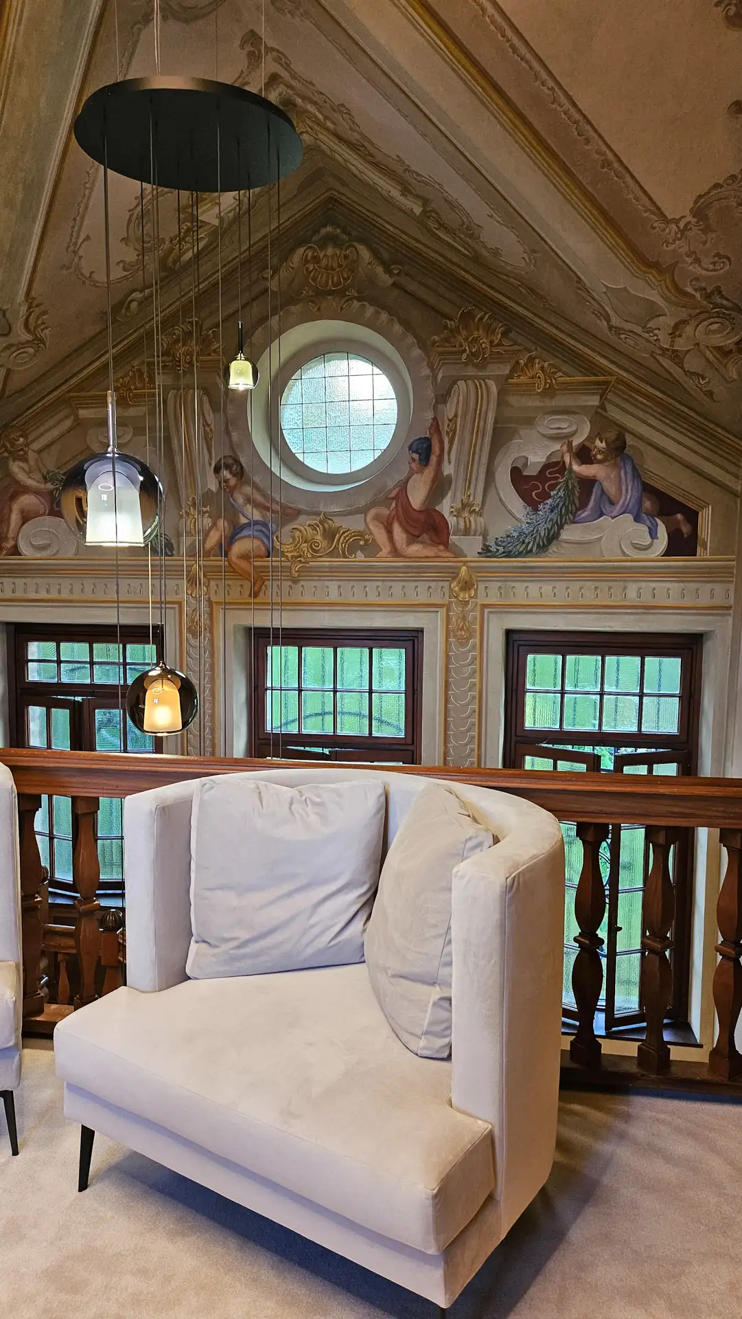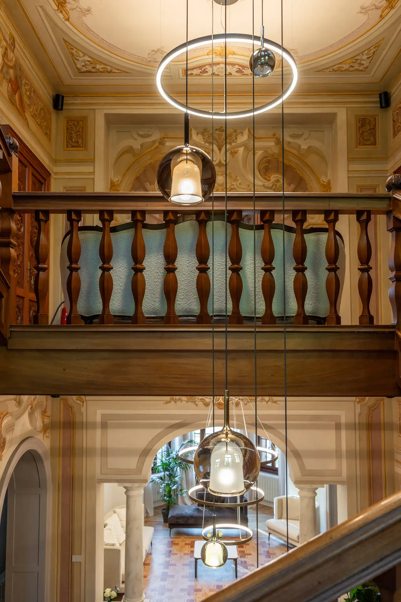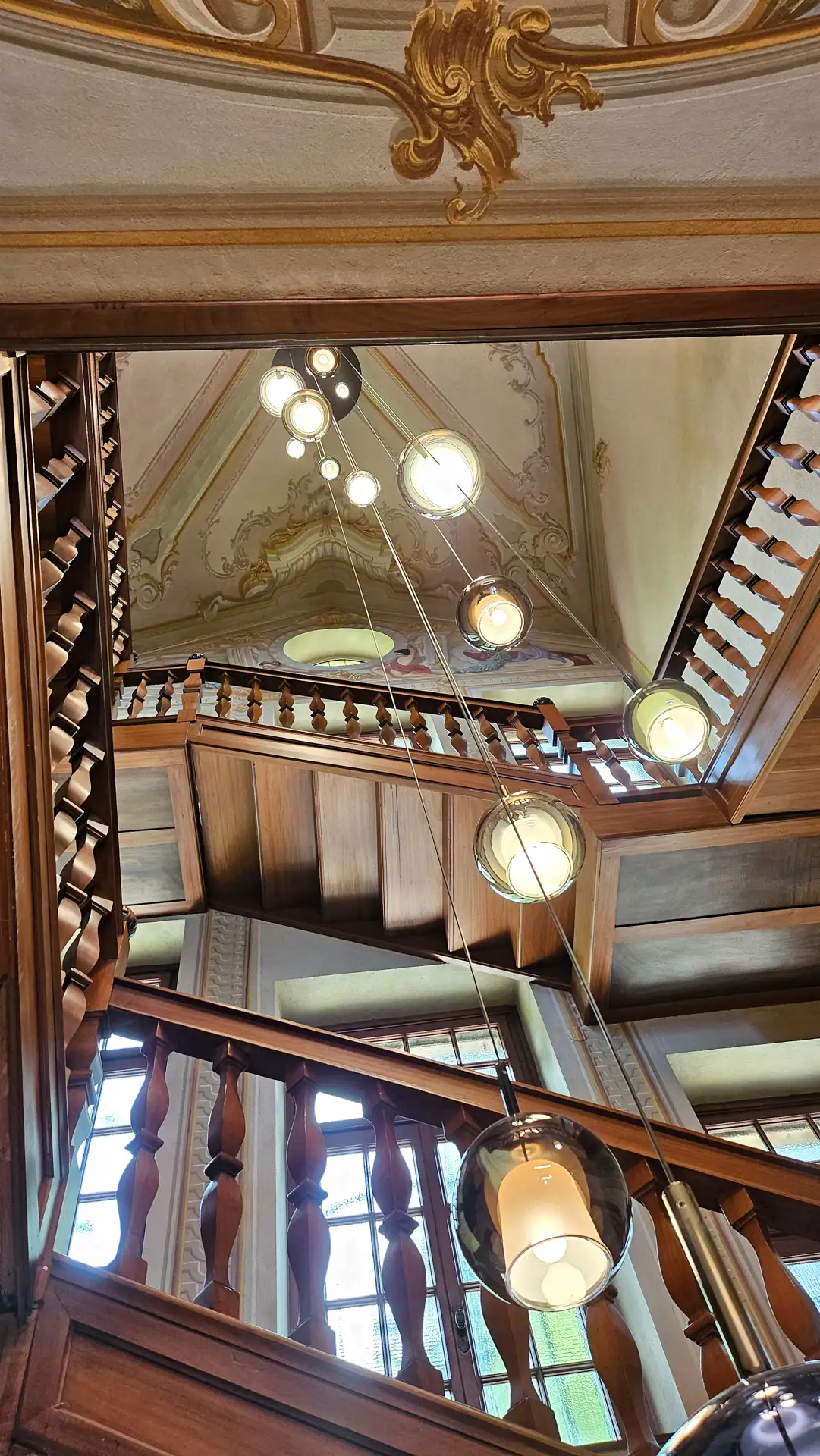 La scala è stata inoltre impreziosita da lampade scenografiche sospese, che creano suggestivi giochi di luce lungo tutta la sua altezza, conferendo un’atmosfera intima e solenne al percorso. Ogni gradino, ora rinvigorito dalla luce, invita l’ospite a salire, immerso in un’armonia di eleganza