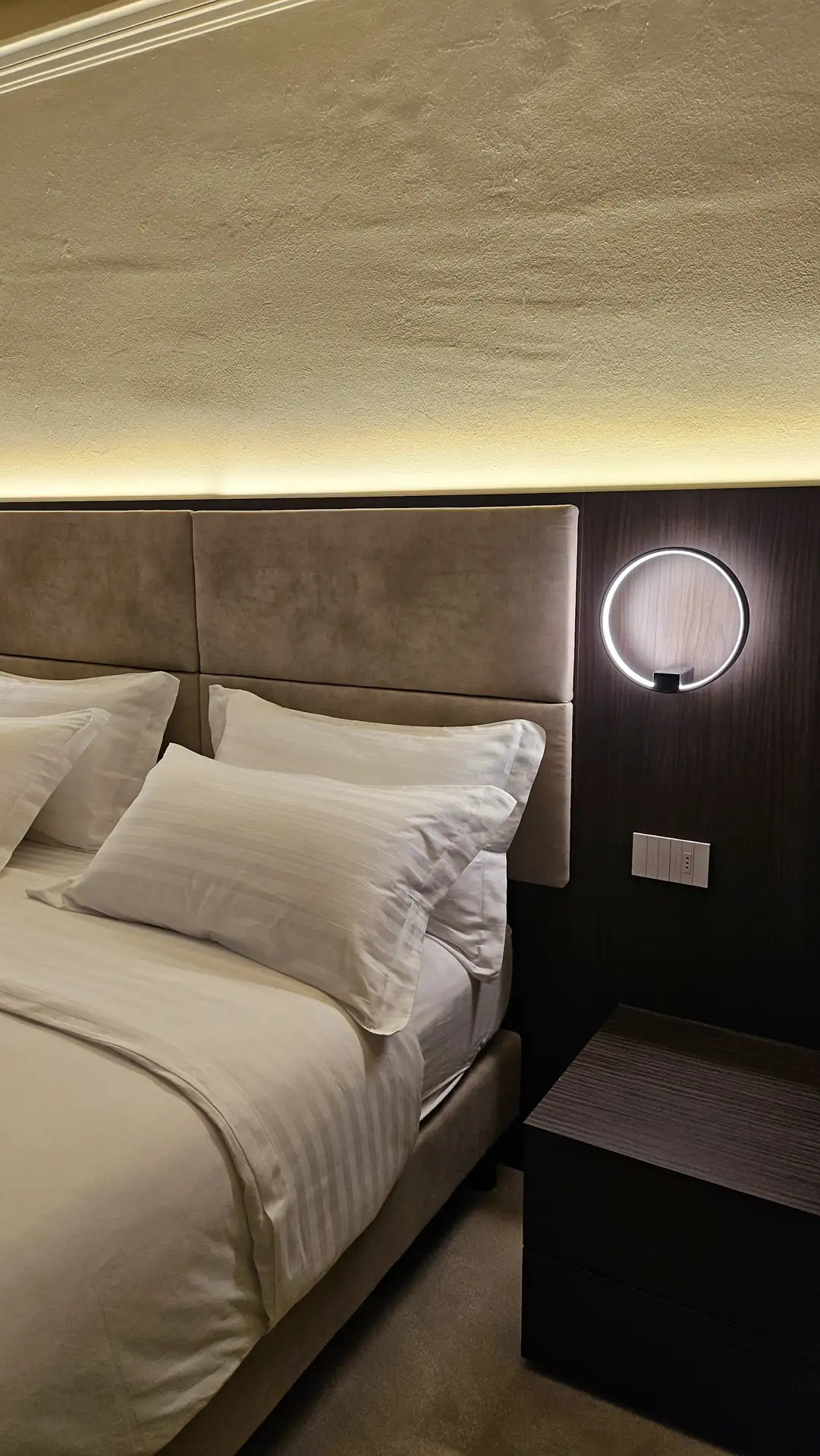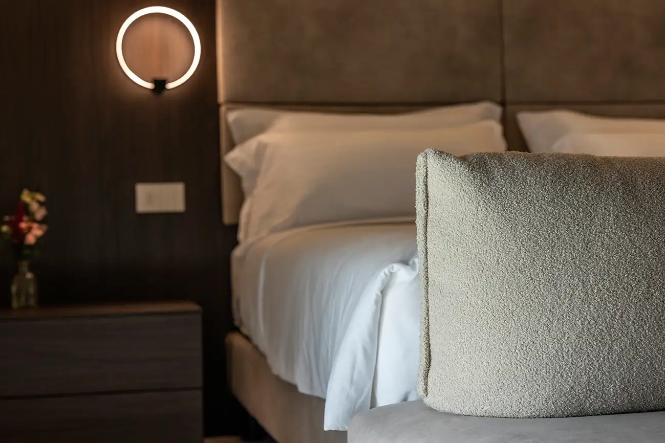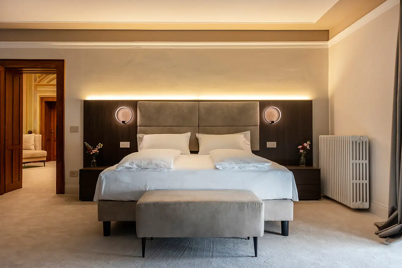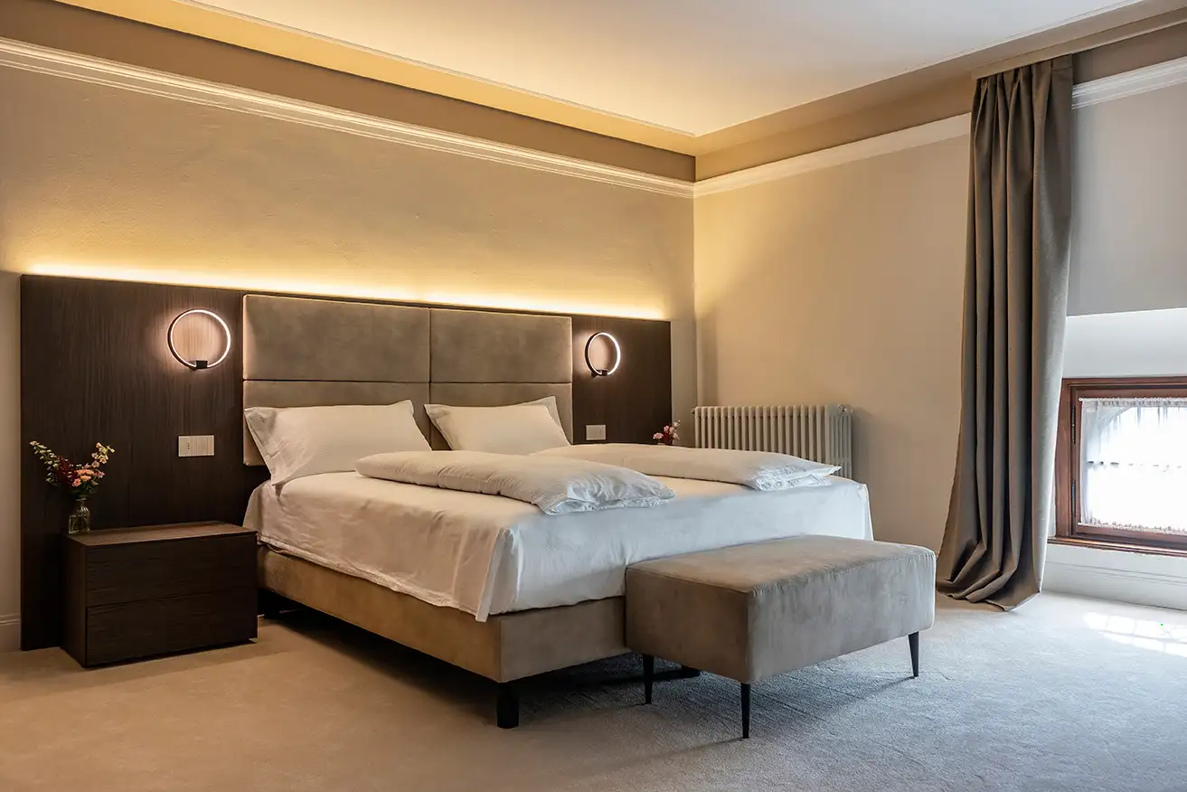 Ai piani superiori, le suite sono state arredate per offrire un’esperienza di soggiorno esclusiva. Il pavimento in moquette dai toni chiari accoglie gli ospiti con morbidezza e raffinatezza, mentre gli imbottiti dalle tinte sabbia e dalle texture avvolgenti rispondono all’esigenza di comfort e eleganza. I drappeggi delle tende, anch’essi nei toni naturali del sabbia e beige, si integrano perfettamente con il resto dell’arredo, creando un’atmosfera di tranquillità e raffinatezza. Le pareti sono trattate con stuccature leggere dai toni chiari, che amplificano la luminosità naturale, mentre le lampade d’arredo, eleganti e funzionali, si rivelano anch’esse come veri e propri oggetti di design. Ogni suite è pensata per offrire agli ospiti un angolo di benessere e intimità, ideale per il riposo dopo una giornata di festeggiamenti o come spazio di relax durante il soggiorno.