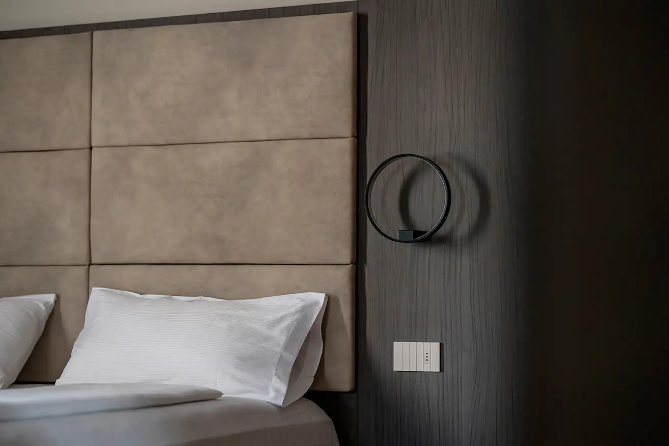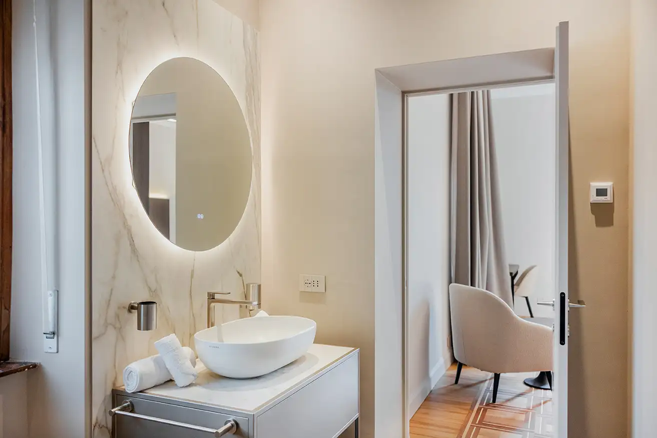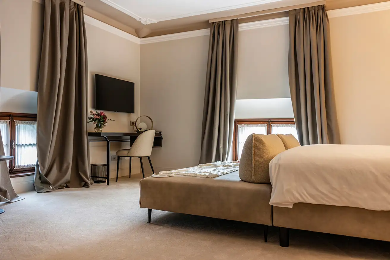 Ai piani superiori, le suite sono state arredate per offrire un’esperienza di soggiorno esclusiva. Il pavimento in moquette dai toni chiari accoglie gli ospiti con morbidezza e raffinatezza, mentre gli imbottiti dalle tinte sabbia e dalle texture avvolgenti rispondono all’esigenza di comfort e eleganza. I drappeggi delle tende, anch’essi nei toni naturali del sabbia e beige, si integrano perfettamente con il resto dell’arredo, creando un’atmosfera di tranquillità e raffinatezza. Le pareti sono trattate con stuccature leggere dai toni chiari, che amplificano la luminosità naturale, mentre le lampade d’arredo, eleganti e funzionali, si rivelano anch’esse come veri e propri oggetti di design. Ogni suite è pensata per offrire agli ospiti un angolo di benessere e intimità, ideale per il riposo dopo una giornata di festeggiamenti o come spazio di relax durante il soggiorno.