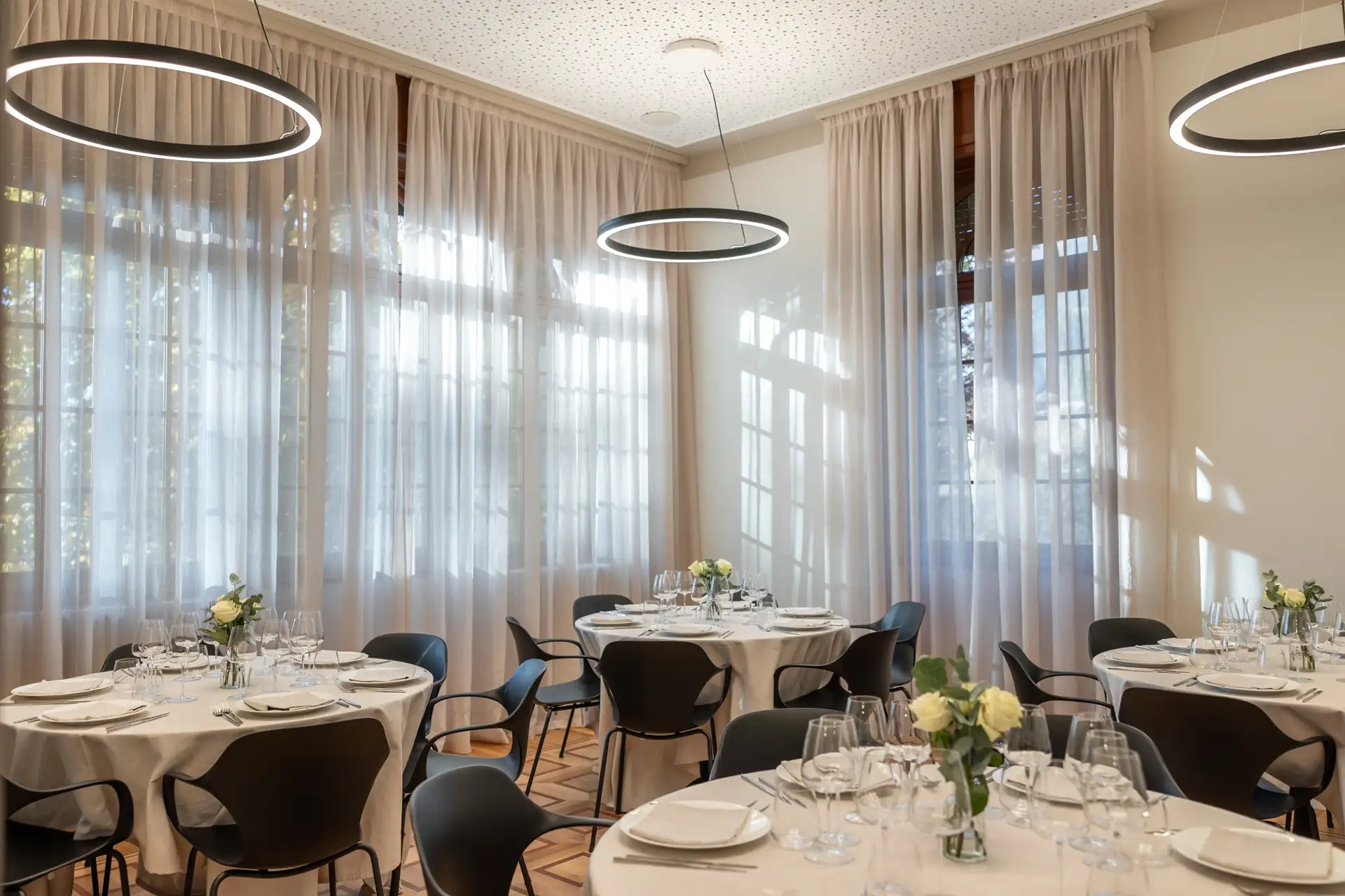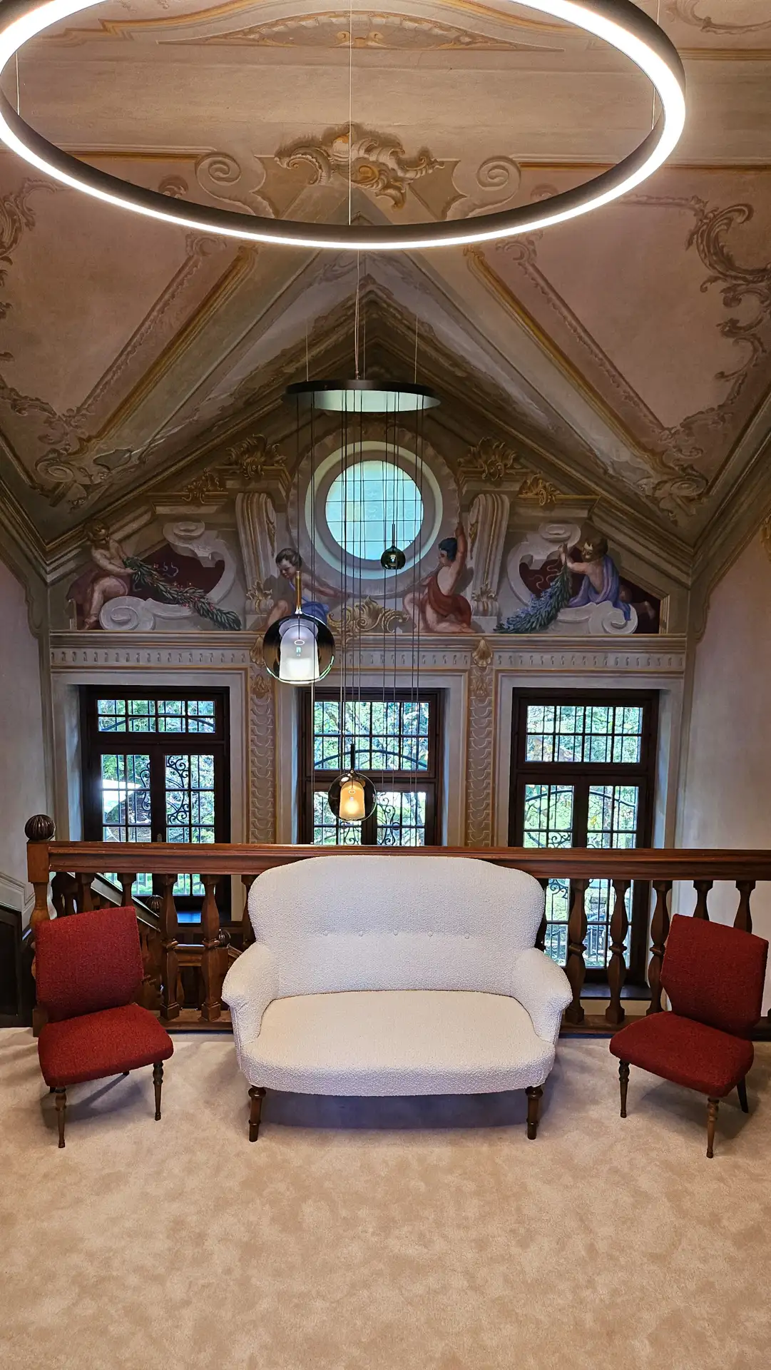 Le sale da cerimonia, situate al piano terra, sono caratterizzate da parquet originale recuperato e perfettamente restaurato. Il legno, trattato e lucidato, riflette la luce che entra dalle ampie finestre, amplificando la percezione di spaziosità e luminosità. Gli arredi, sobri ma di grande eleganza, sono studiati per non sottrarre nulla alla maestosità della sala, ma al contempo offrono comfort e praticità per le cerimonie e i ricevimenti. Le lampade di design, scelte con cura, diventano protagoniste dell’ambiente. Ogni luce è stata selezionata per il suo impatto visivo: forme raffinate e moderne, ma con un tocco di classe che richiama la tradizione del passato, creando un contrasto armonioso tra antico e nuovo.