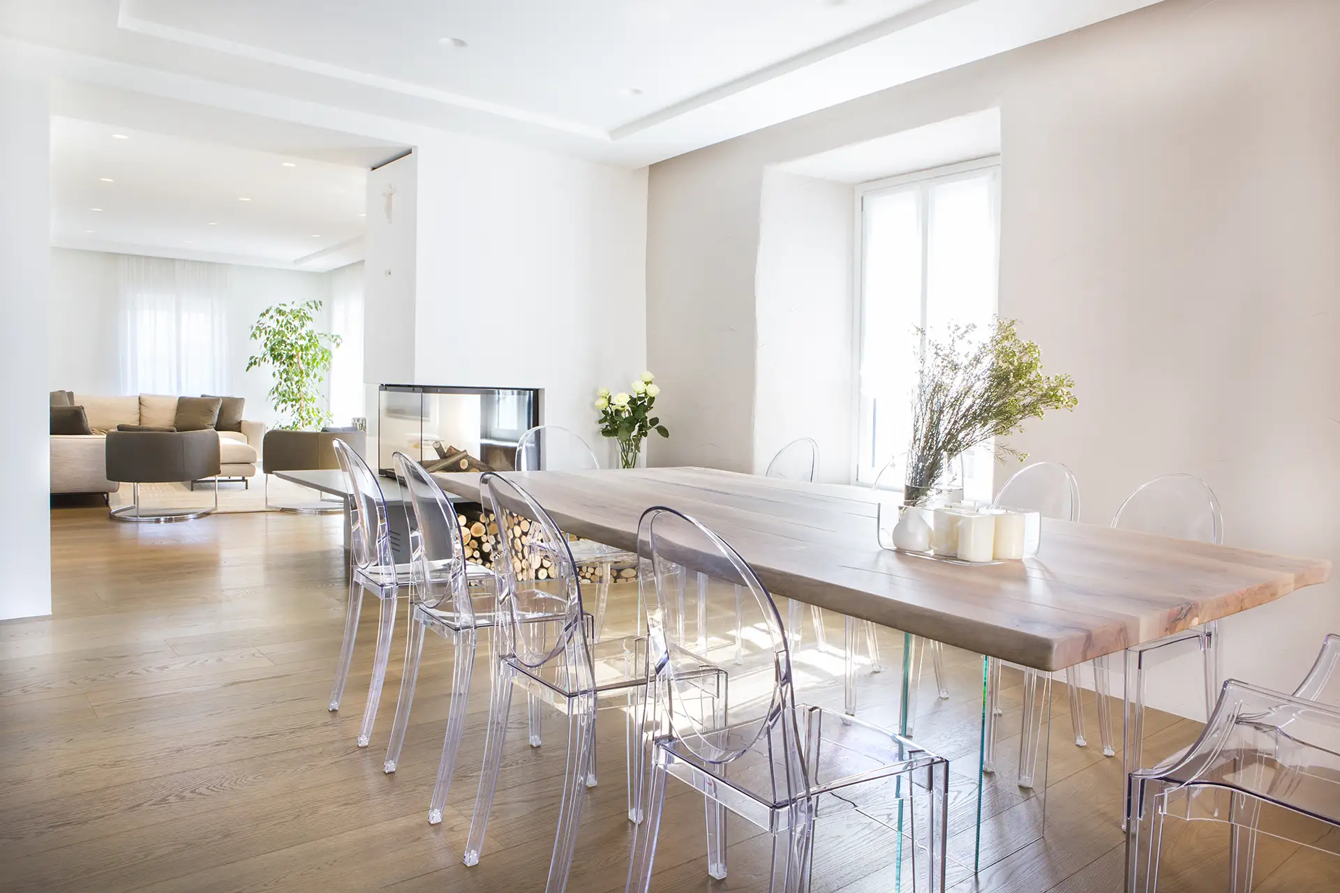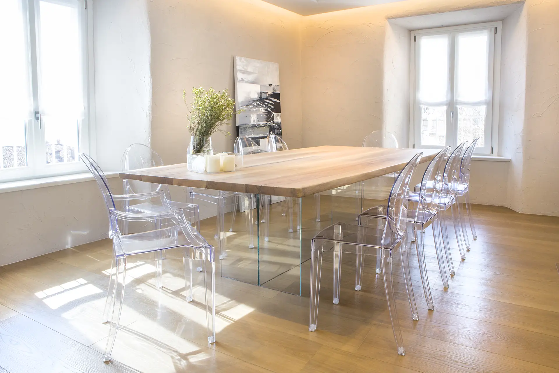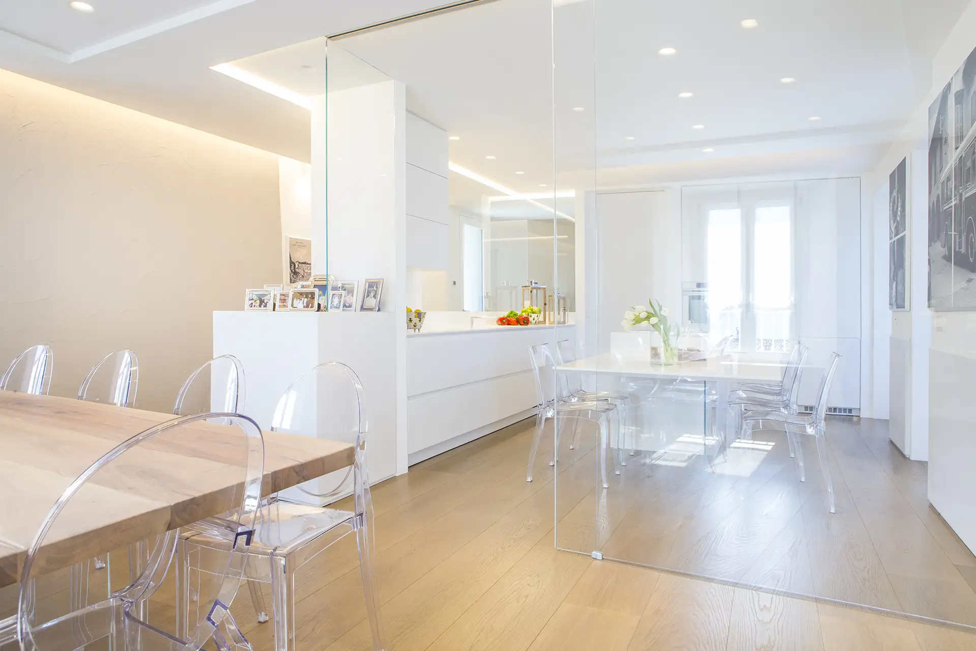Il progetto si distingue per un’atmosfera di grande luminosità, valorizzata da una palette cromatica chiara e da scelte materiche leggere e trasparenti. Il bianco domina negli arredi, amplificando la luce naturale e conferendo allo spazio un senso di purezza e apertura. Materiali come il vetro, il polipropilene e il legno chiaro – utilizzato sia per il top del tavolo che per il parquet – contribuiscono a creare un ambiente arioso, essenziale e accogliente.