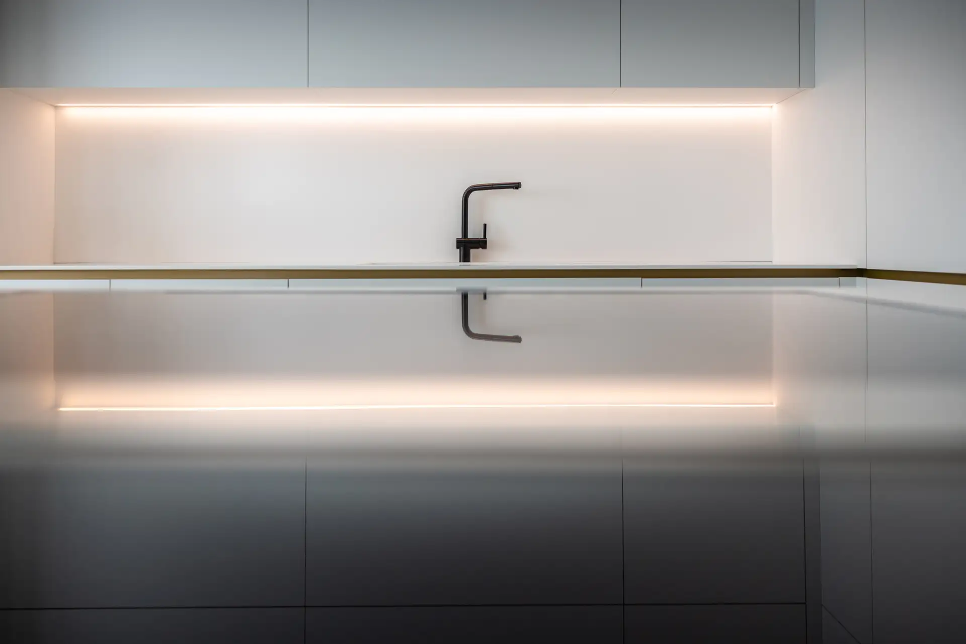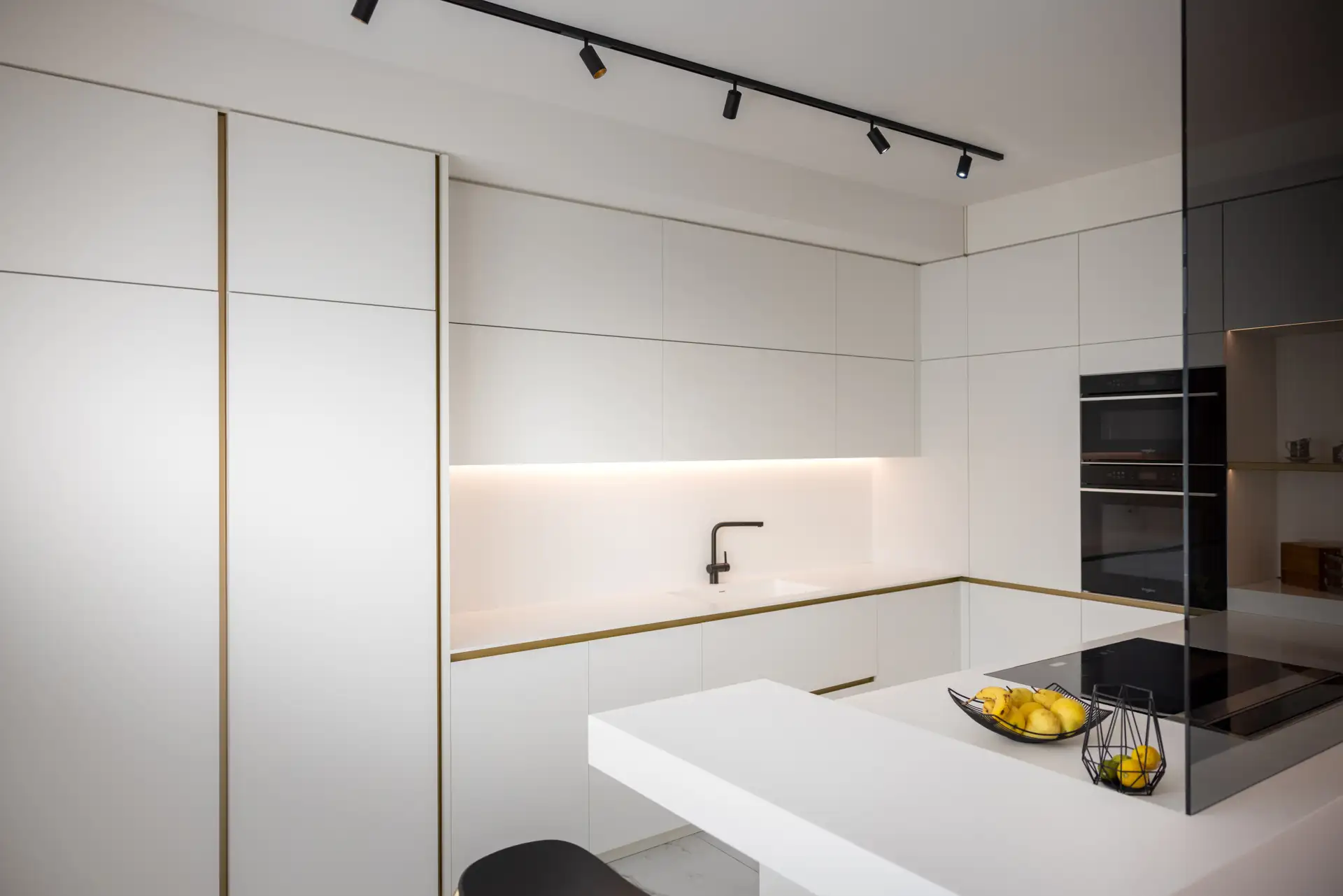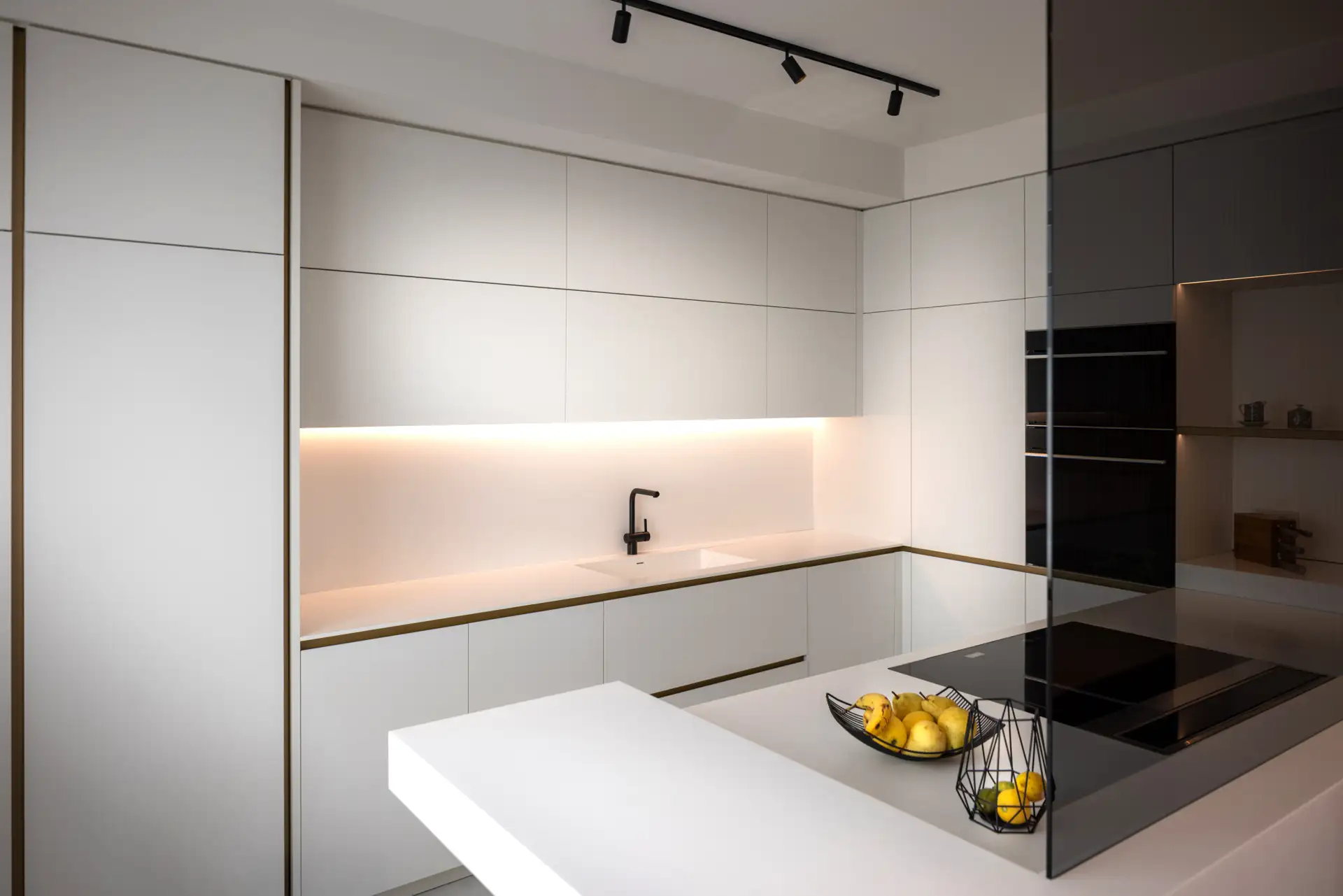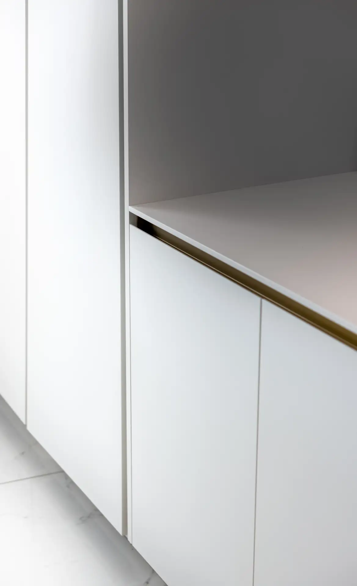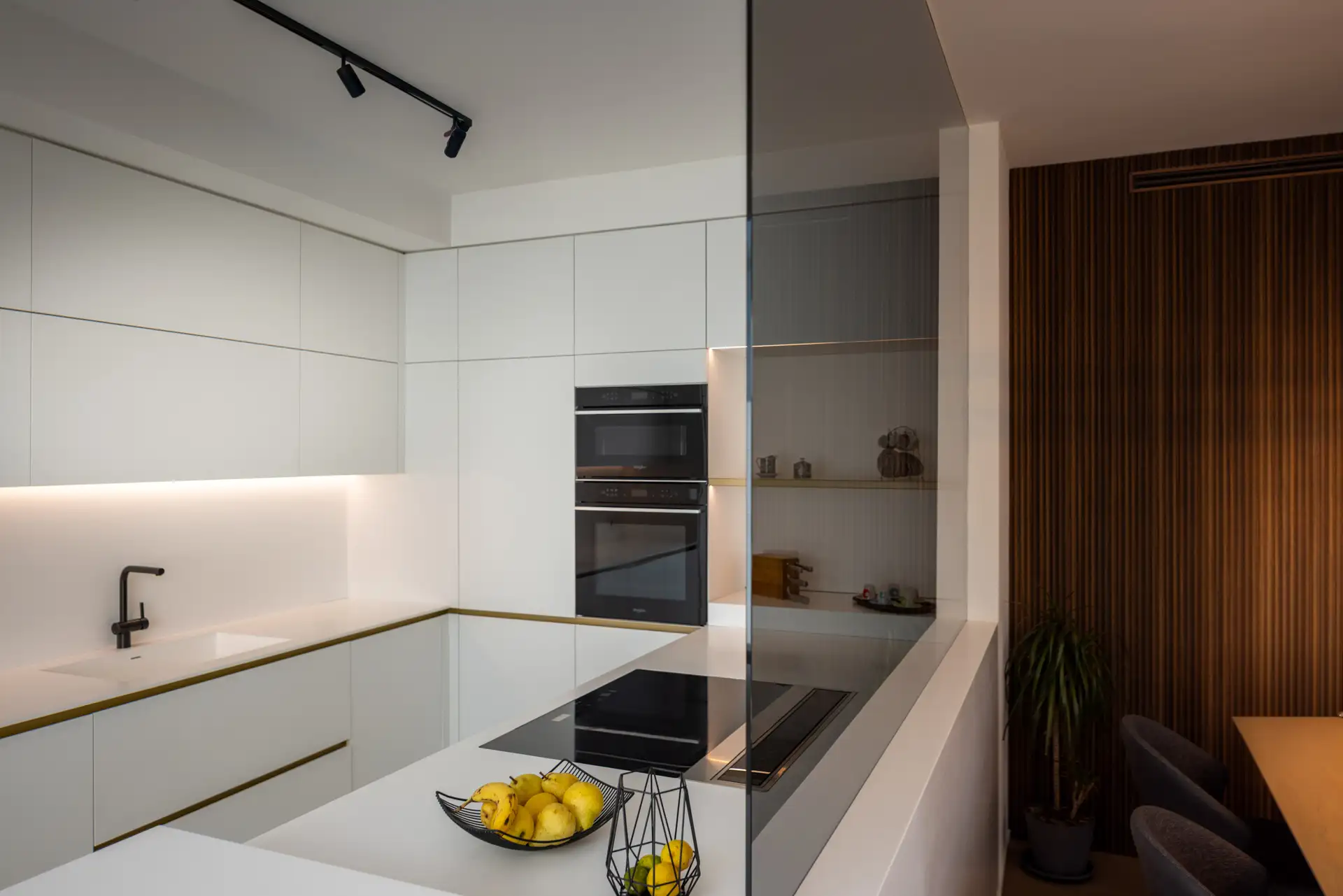 Una parete in vetro separa il living dalla cucina, creando un effetto che richiama le quinte di un teatro. La scelta del bianco purissimo dei top e dei mobili, che si combina con l’ottone delle gole e dei dettagli in un gioco di contrasti eleganti garantisce alla zona cooking aspetto scenografico. I ripiani a vista in ottone e i piani di lavoro scorrevoli, perfettamente integrati nell’architettura, non sono solo funzionali ma anche parte integrante della composizione visiva.