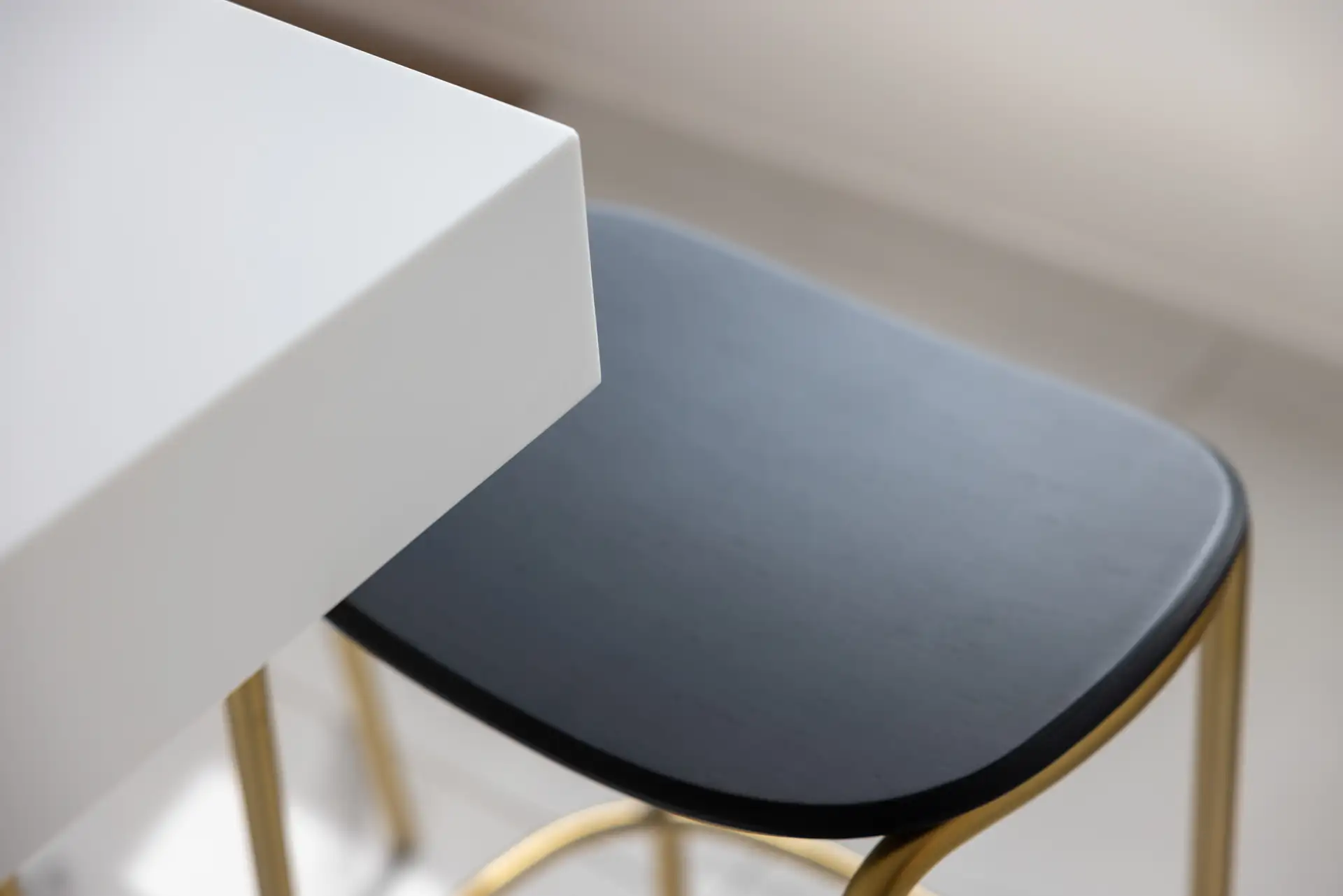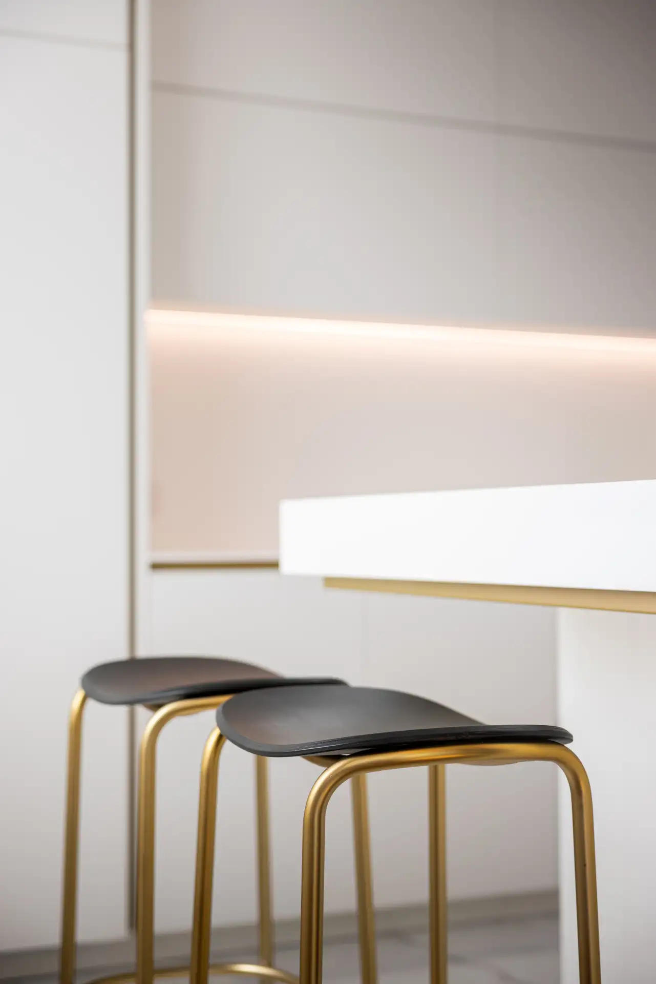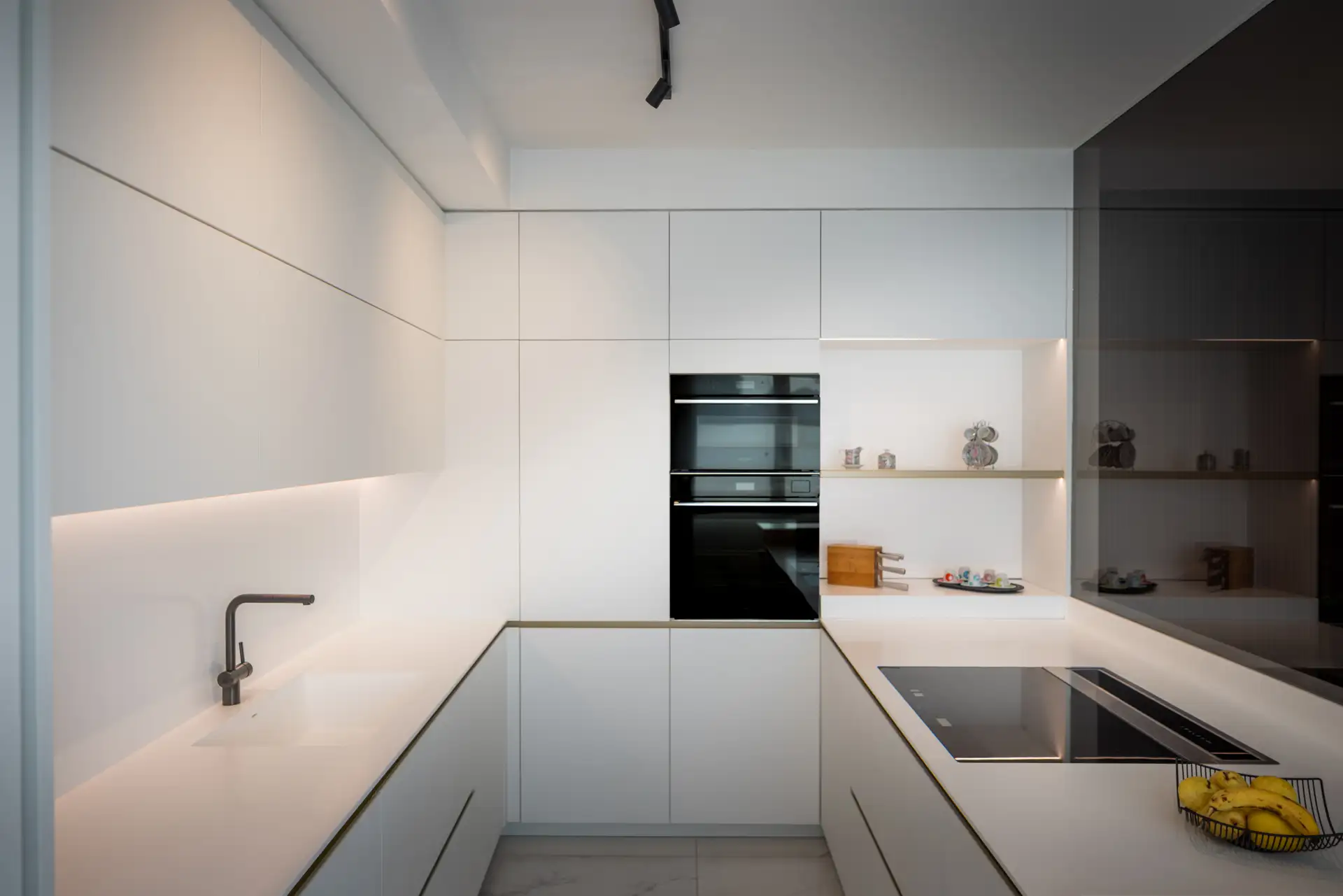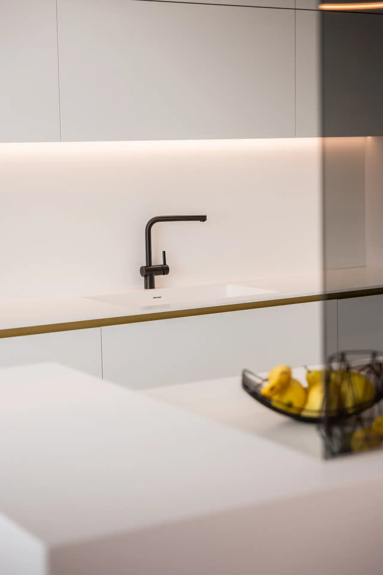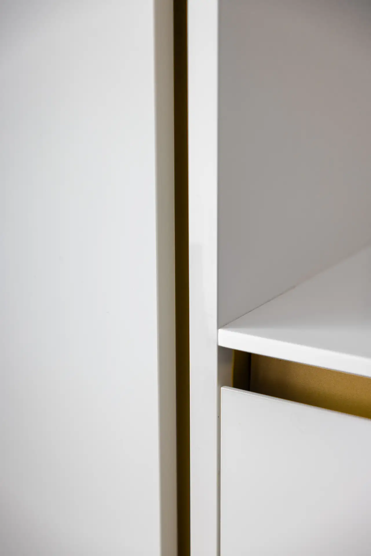 Una parete in vetro separa il living dalla cucina, creando un effetto che richiama le quinte di un teatro. La scelta del bianco purissimo dei top e dei mobili, che si combina con l’ottone delle gole e dei dettagli in un gioco di contrasti eleganti garantisce alla zona cooking aspetto scenografico. I ripiani a vista in ottone e i piani di lavoro scorrevoli, perfettamente integrati nell’architettura, non sono solo funzionali ma anche parte integrante della composizione visiva.