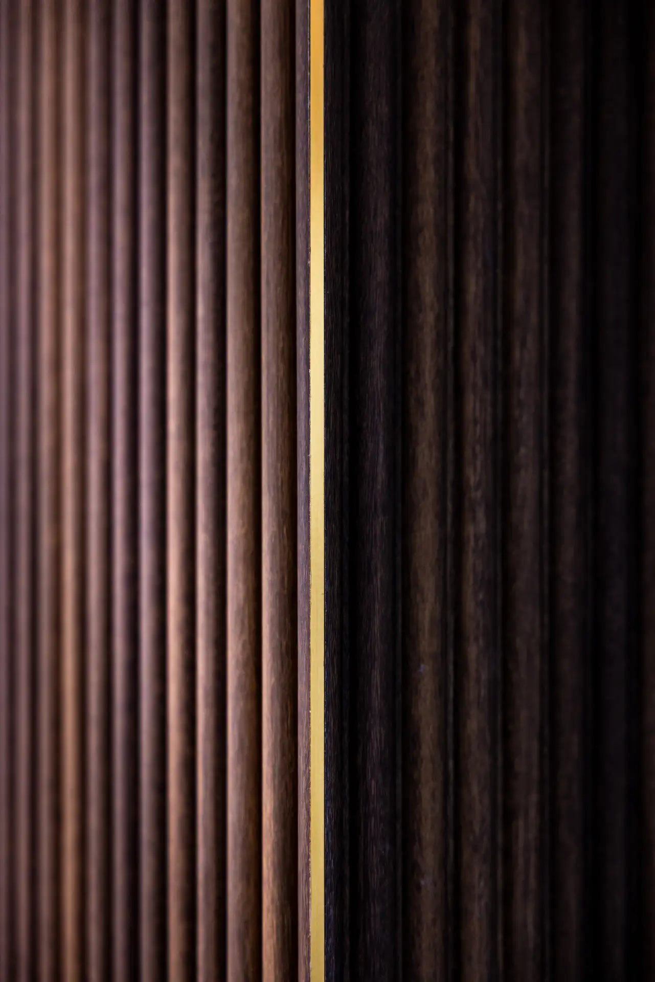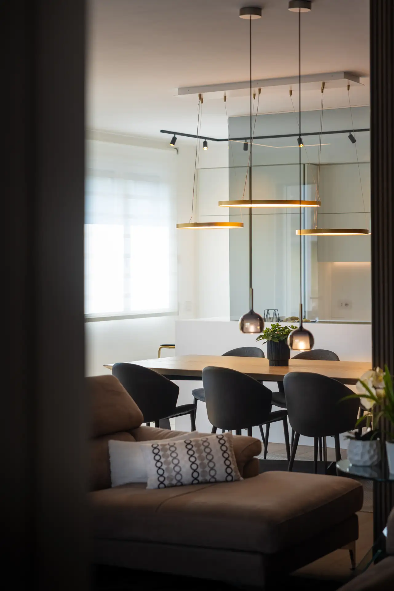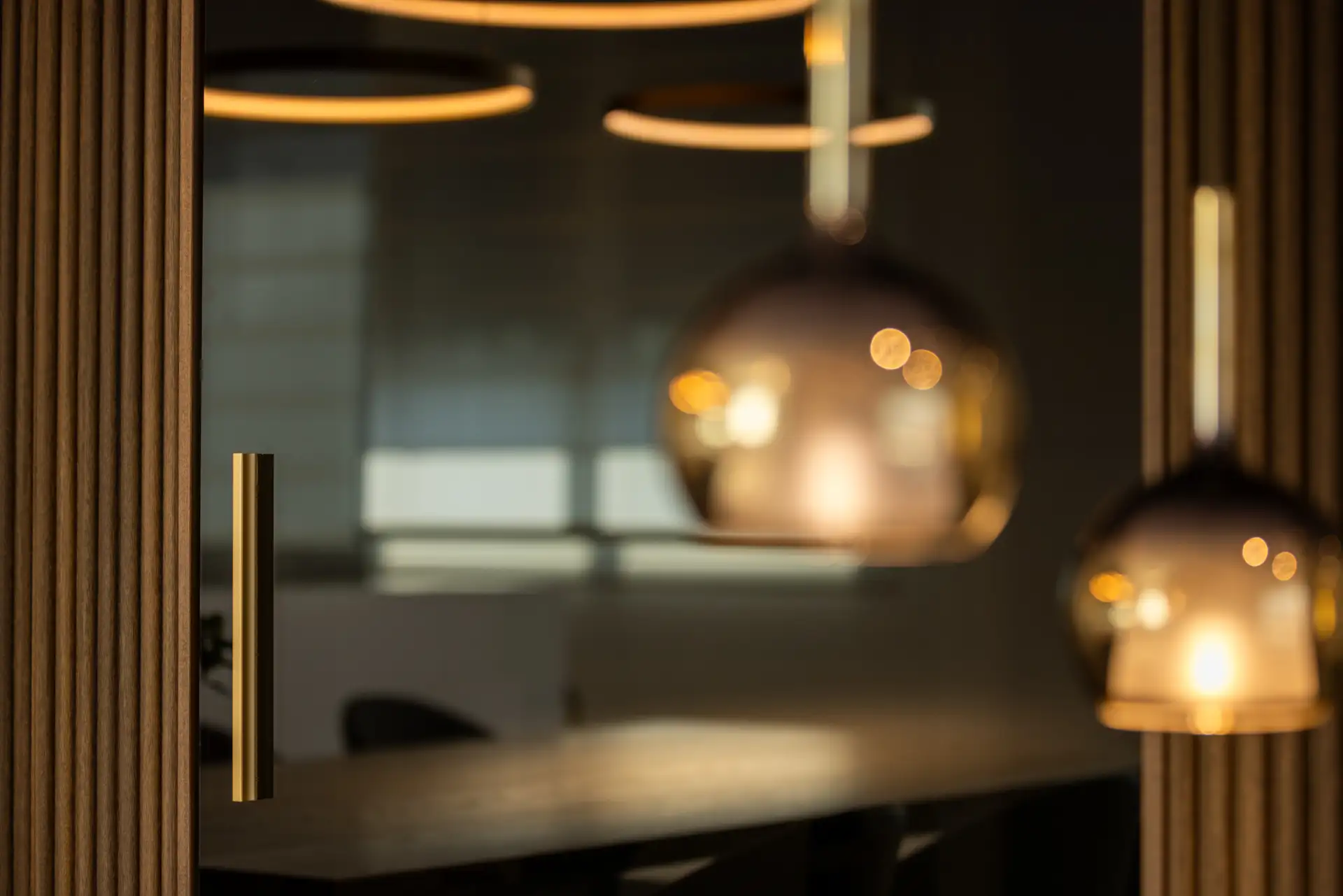 Varcata la soglia d’ingresso, una parete in rovere cannettato accoglie con la sua eleganza discreta, una scelta che sottolinea la modernità dell’abitazione senza rinunciare alla calda accoglienza del legno. La linearità della parete è interrotta soltanto da una porta in vetro fumè a tutta altezza, che fa da apertura verso la zona notte senza compromettere la continuità estetica dell’ambiente.