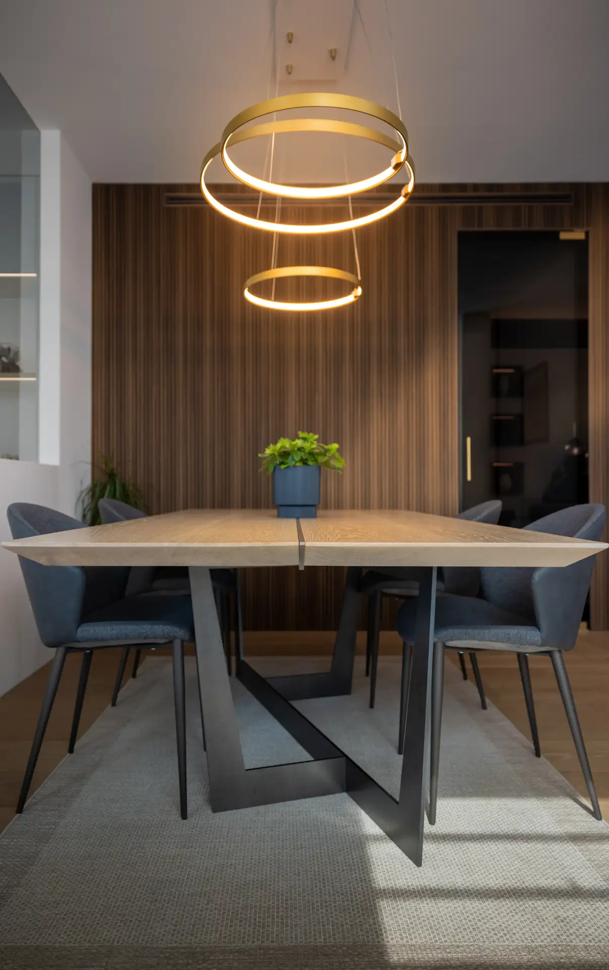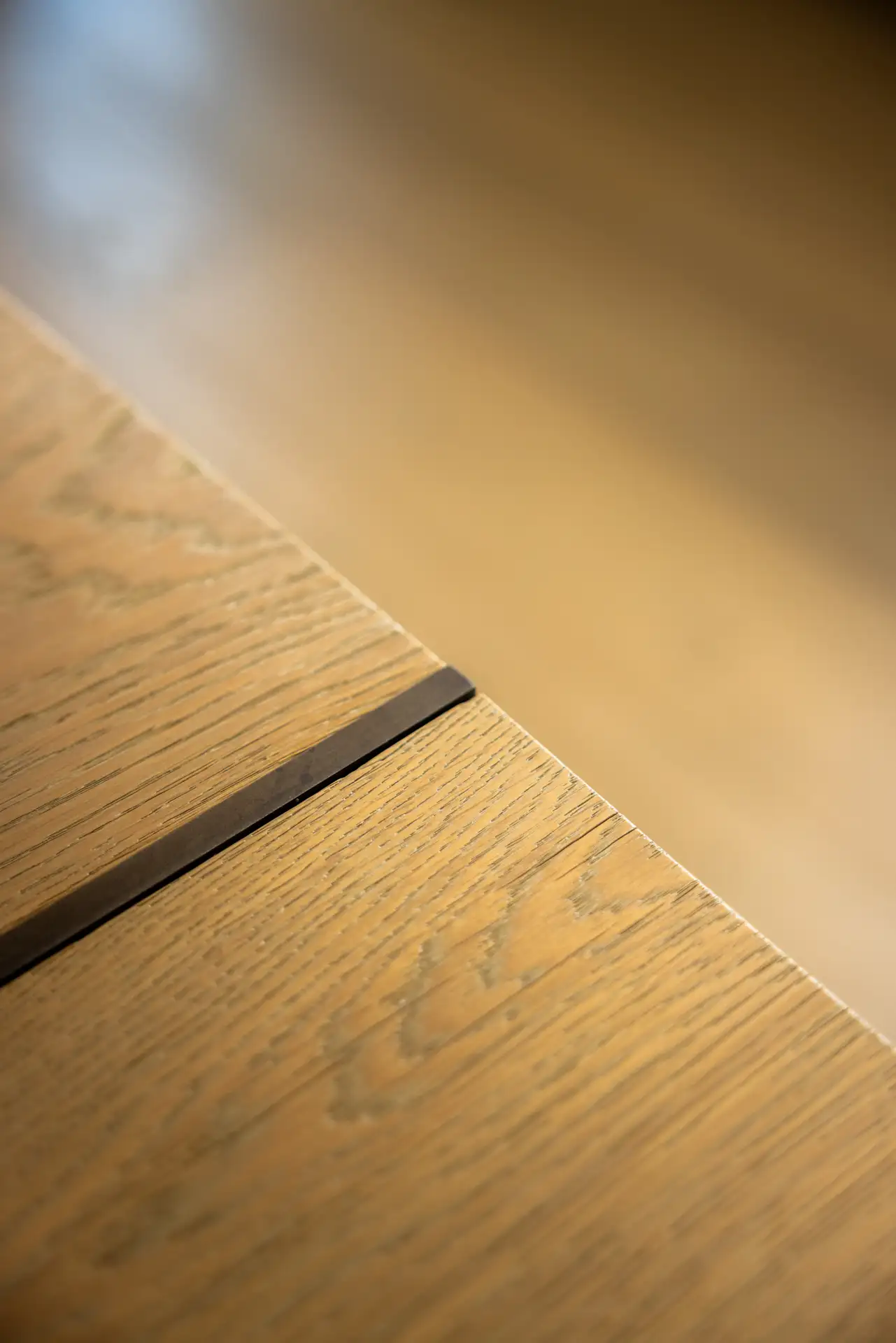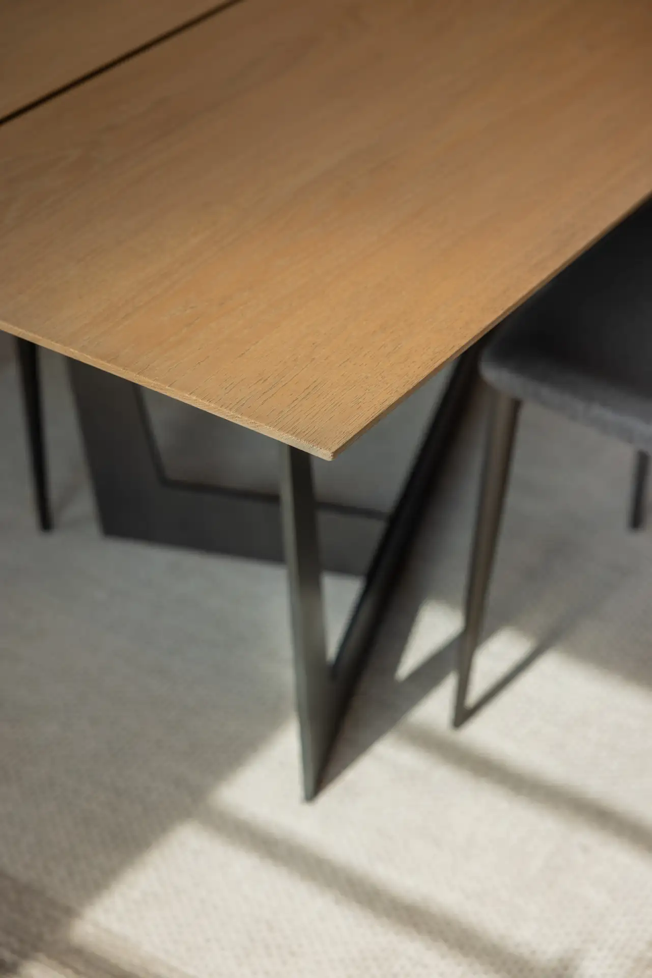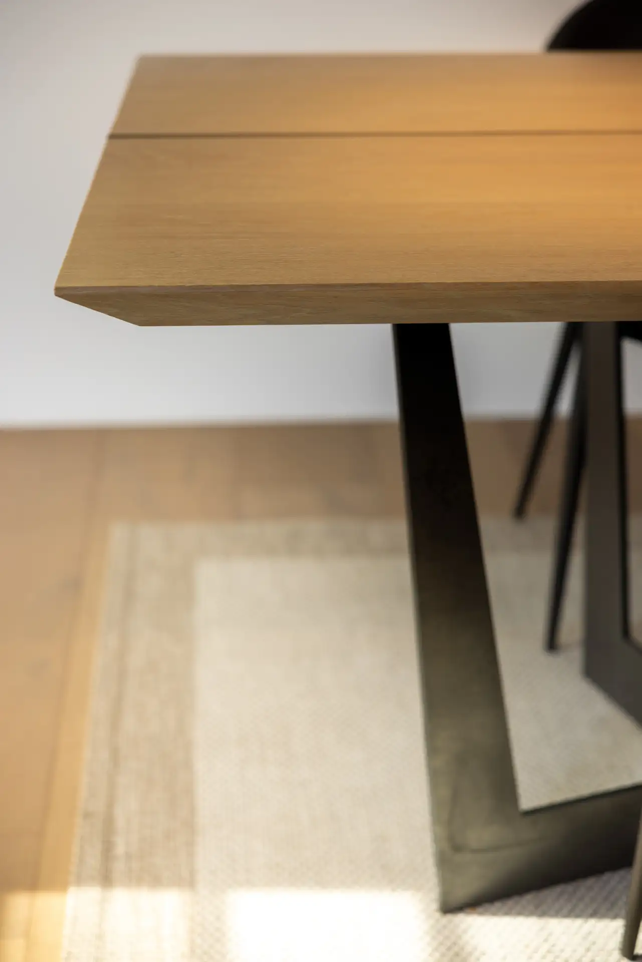 Ogni dettaglio è stato studiato sartorialmente, come nel caso del tavolo con basamento in ferro crudo cerato. Il top, realizzato con due tavole in rovere sapientemente unite, presenta uno smusso perimetrale che alleggerisce lo spessore con una spettacolare geometria visiva. Il design del tavolo risulta così semplice ma straordinariamente curato, un pezzo unico che fa da punto focale nella zona pranzo.
