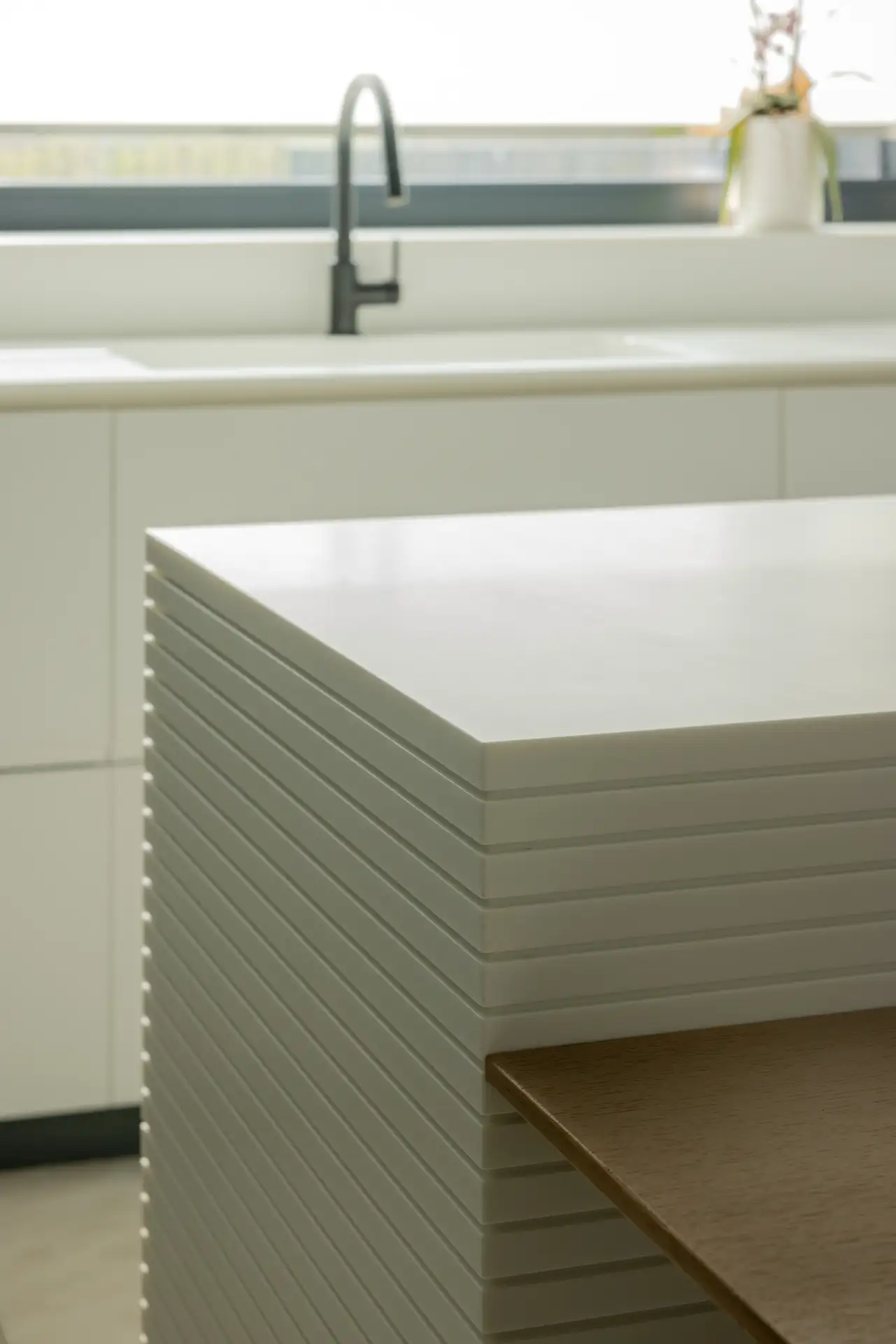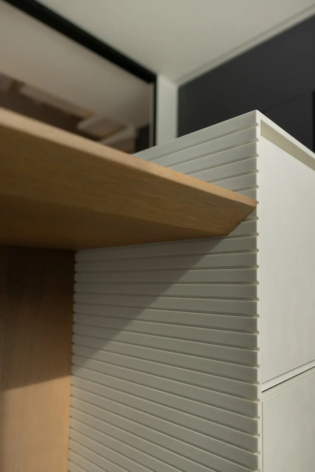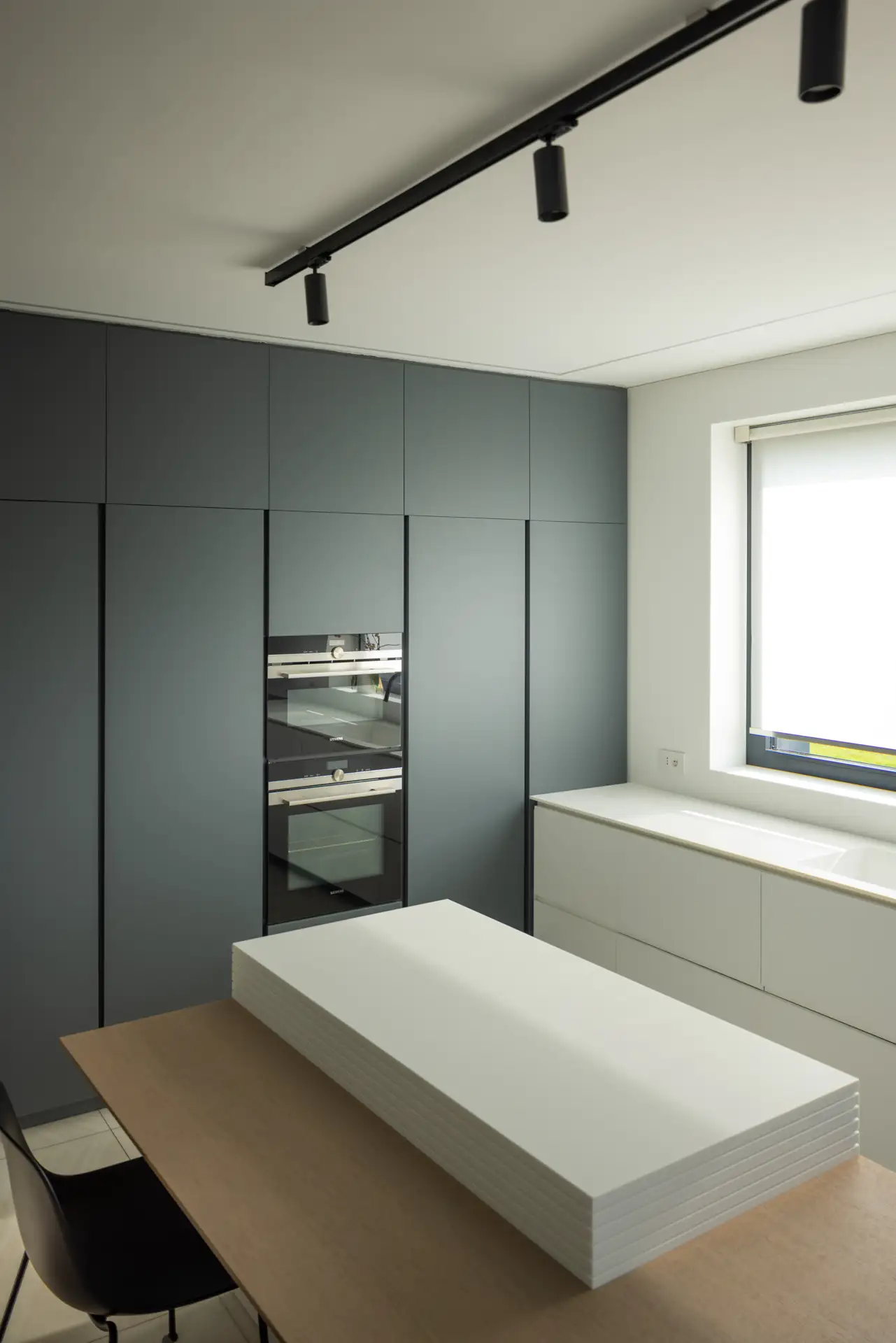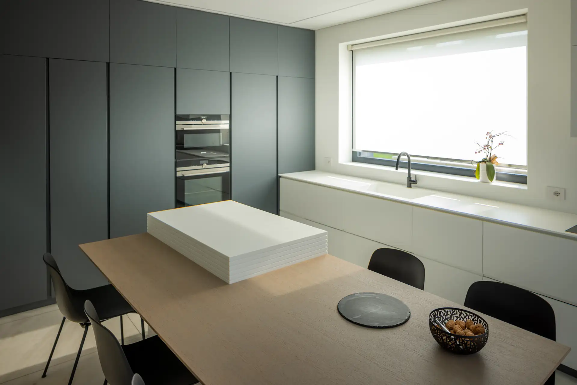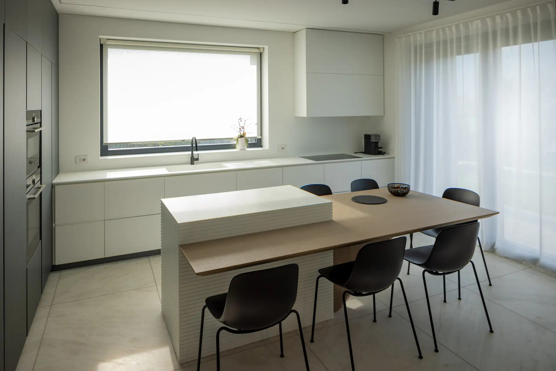 La cucina si distingue per il suo linguaggio essenziale, dominato dal bianco e dal grigio, scaldata dalla presenza di un grande tavolo con top in rovere. Il gioco di contrasti tra superfici lucide e materiche crea un ambiente sofisticato ma conviviale. La luce proveniente dalla grande finestra scivola sulla parete rivestita interamente in solid surface e si insinua nelle fresature sui fianchi dell’isola dando vita a un raffinato gioco di ombre. Le fresate si connettono con millimetrica precisione al tavolo in legno, che funge da elemento di raccordo tra funzionalità e calore domestico. Il piano cottura filotop e il lavabo integrato scompaiono visivamente nel top, contribuendo a creare una sensazione di pulizia e continuità delle superfici.