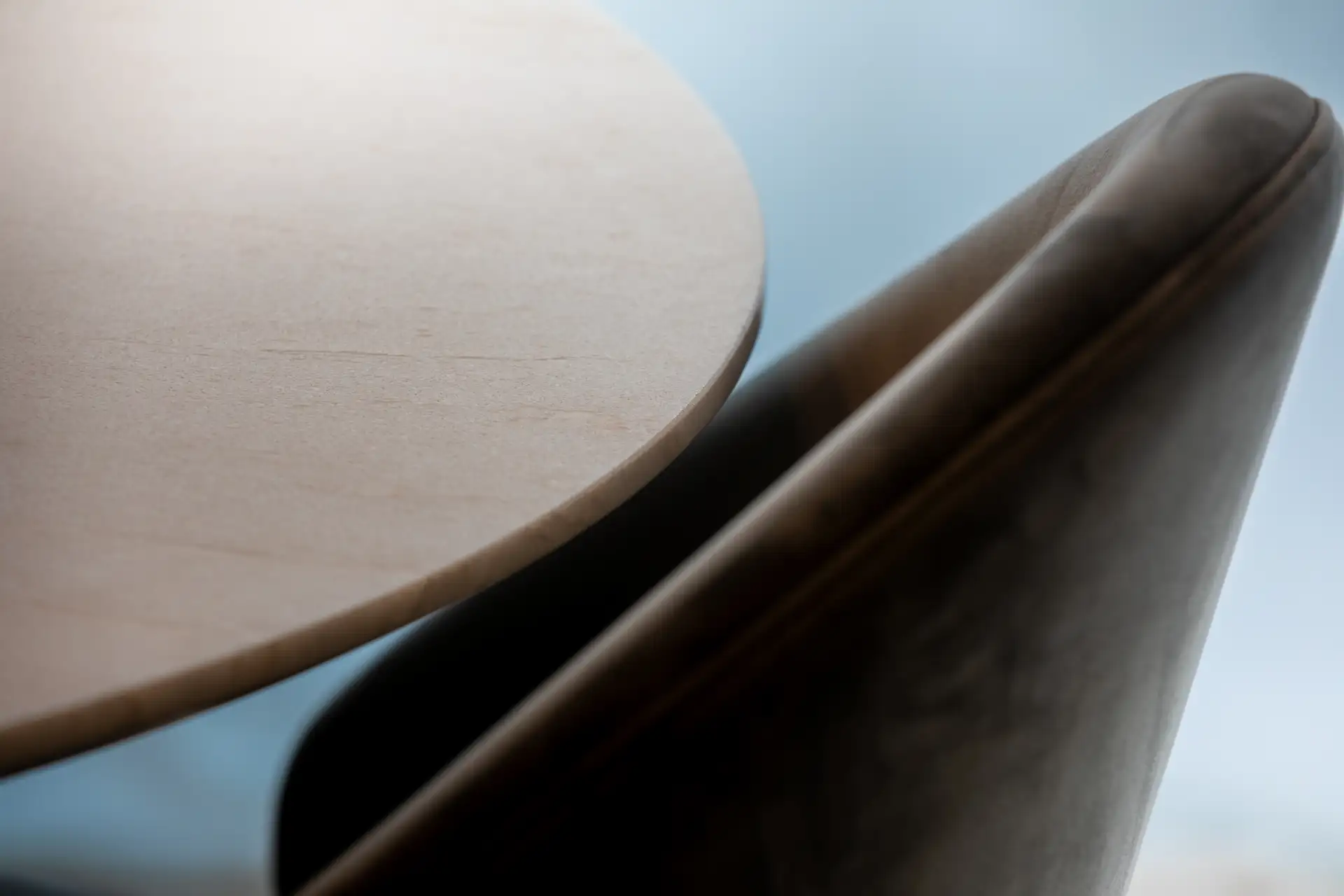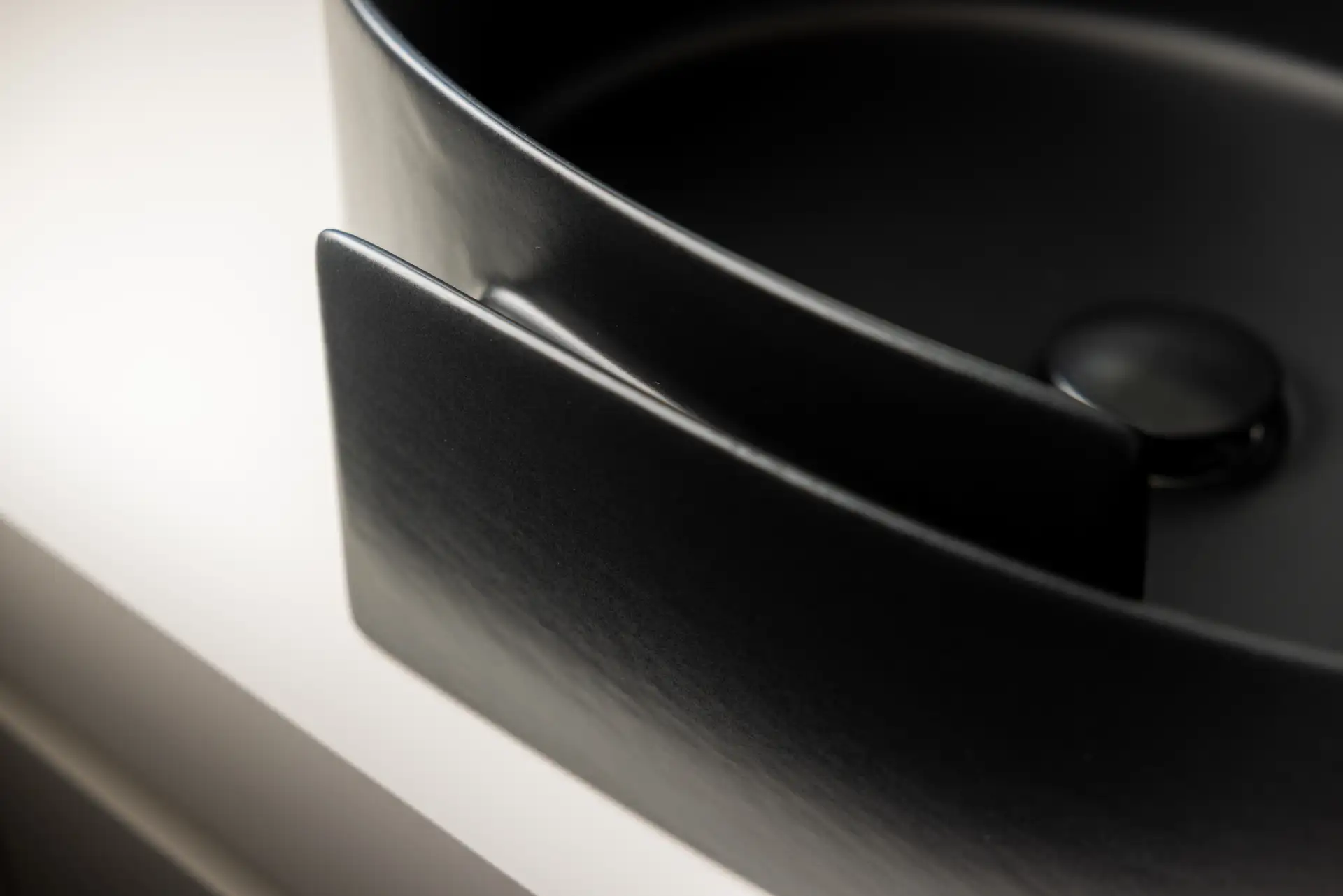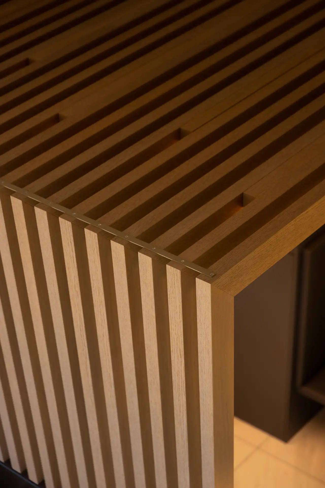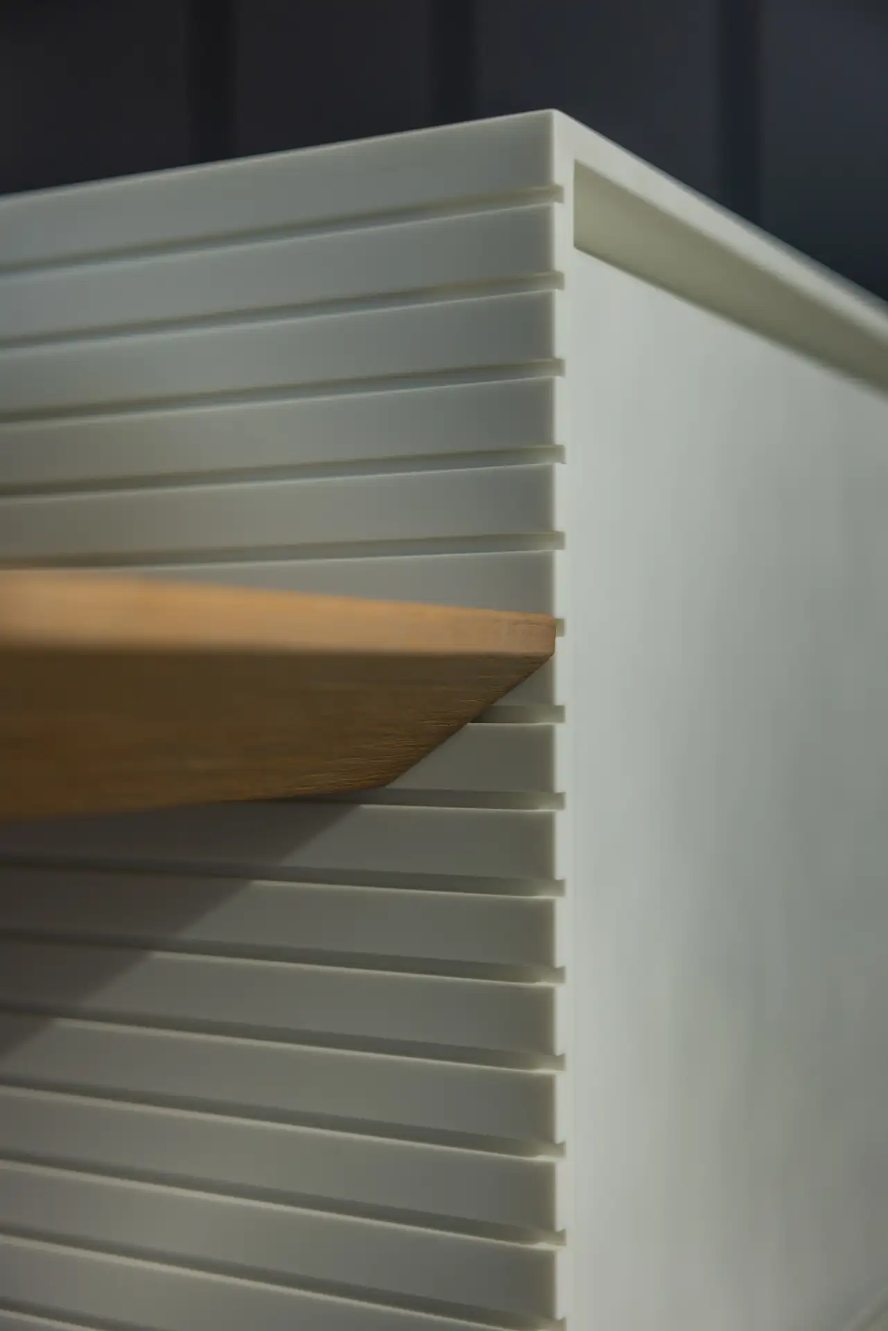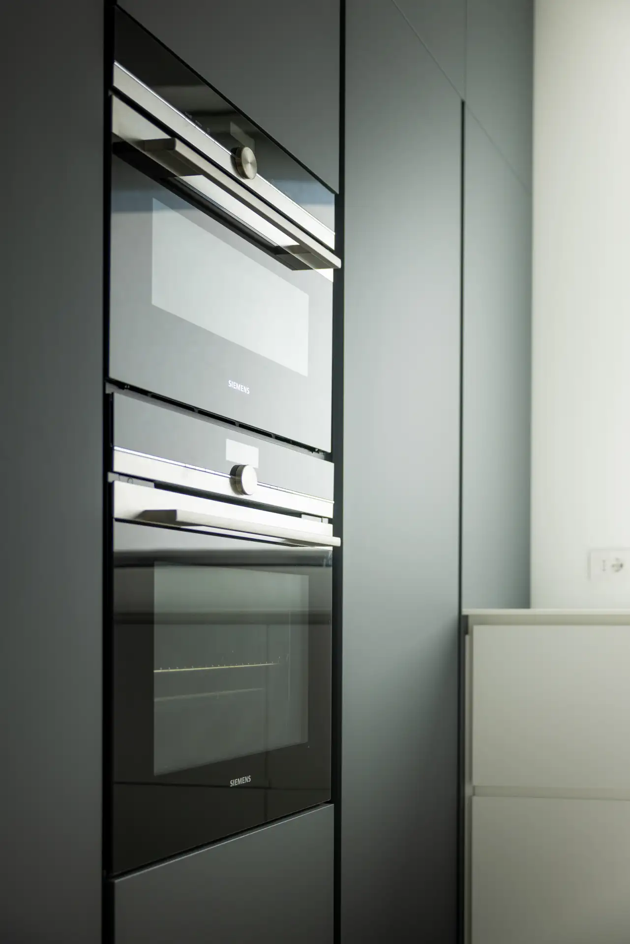 La cucina si distingue per il suo linguaggio essenziale, dominato dal bianco e dal grigio, scaldata dalla presenza di un grande tavolo con top in rovere. Il gioco di contrasti tra superfici lucide e materiche crea un ambiente sofisticato ma conviviale. La luce proveniente dalla grande finestra scivola sulla parete rivestita interamente in solid surface e si insinua nelle fresature sui fianchi dell’isola dando vita a un raffinato gioco di ombre. Le fresate si connettono con millimetrica precisione al tavolo in legno, che funge da elemento di raccordo tra funzionalità e calore domestico. Il piano cottura filotop e il lavabo integrato scompaiono visivamente nel top, contribuendo a creare una sensazione di pulizia e continuità delle superfici.