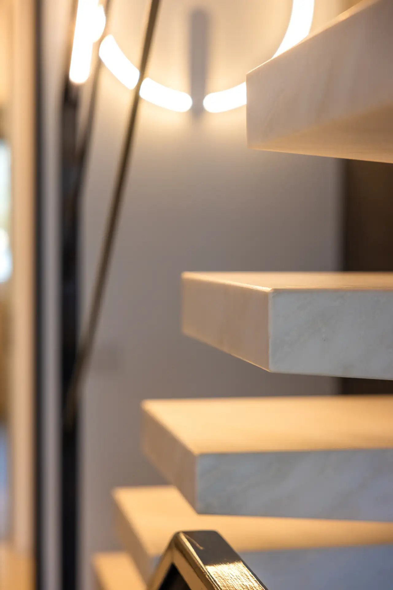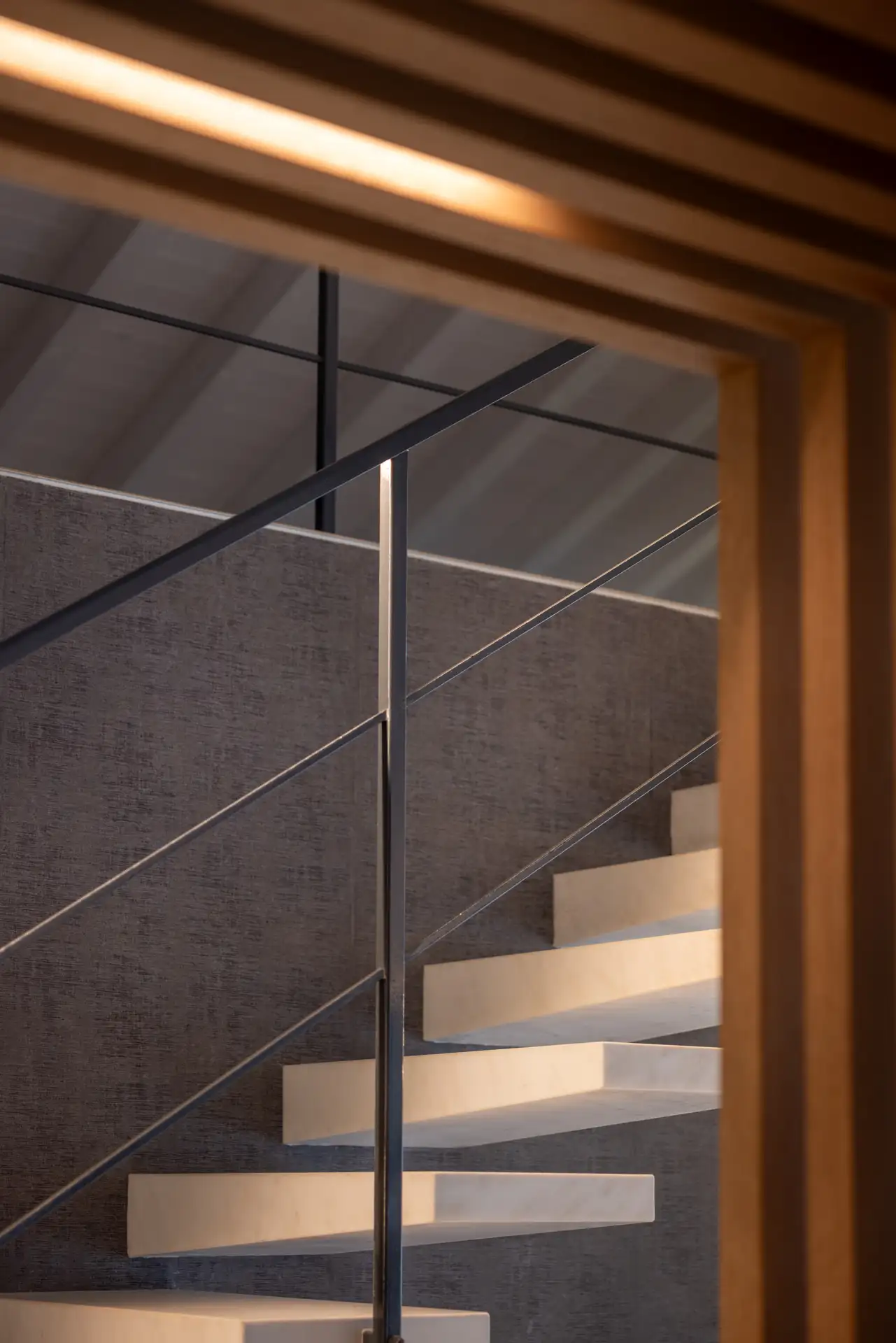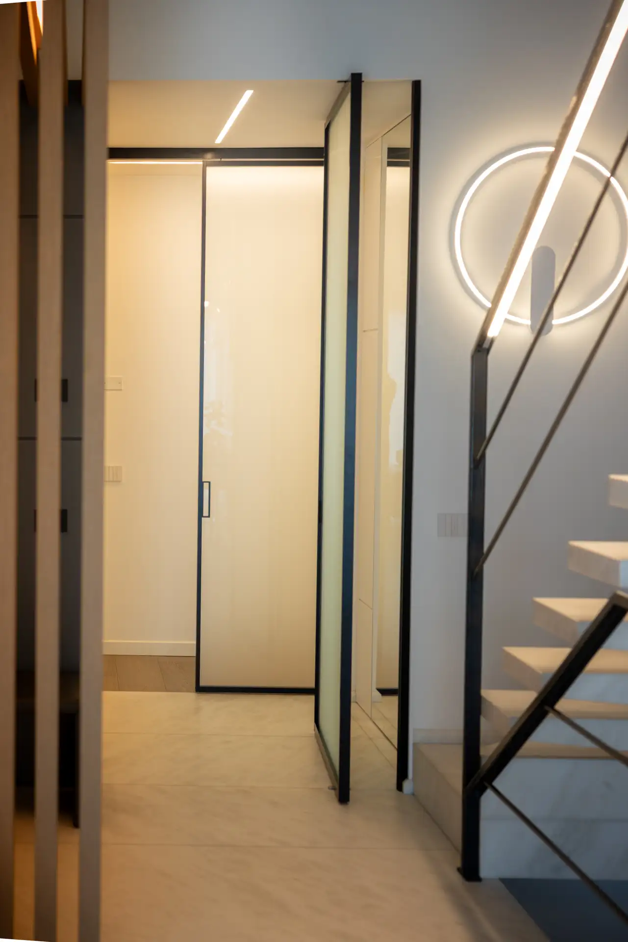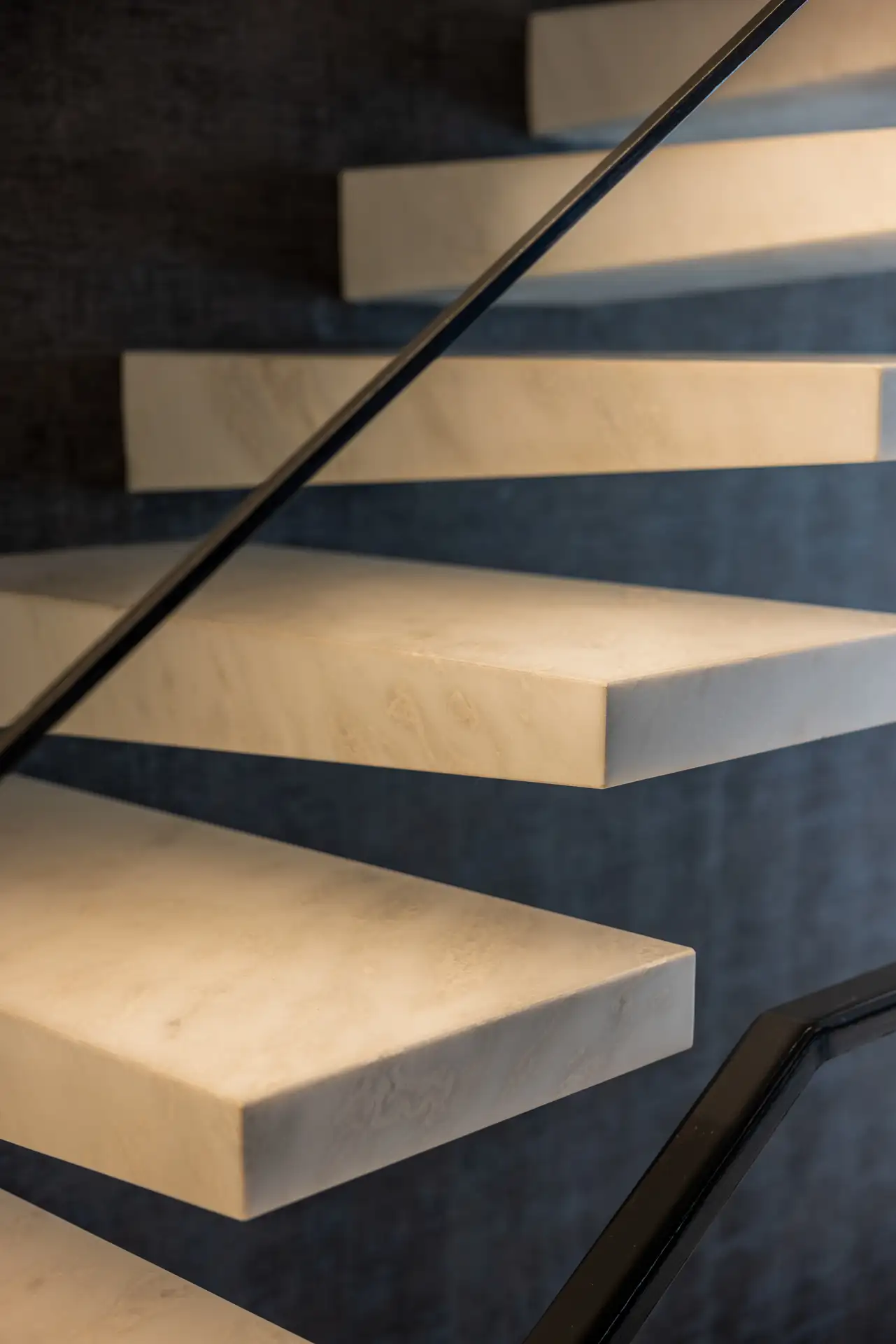 La scala minimalista collega zona giorno e zona notte, con gradini sospesi in marmo dal taglio asimmetrico e un corrimano in ferro impreziosito da luci LED che sottolineano il disegno architettonico.