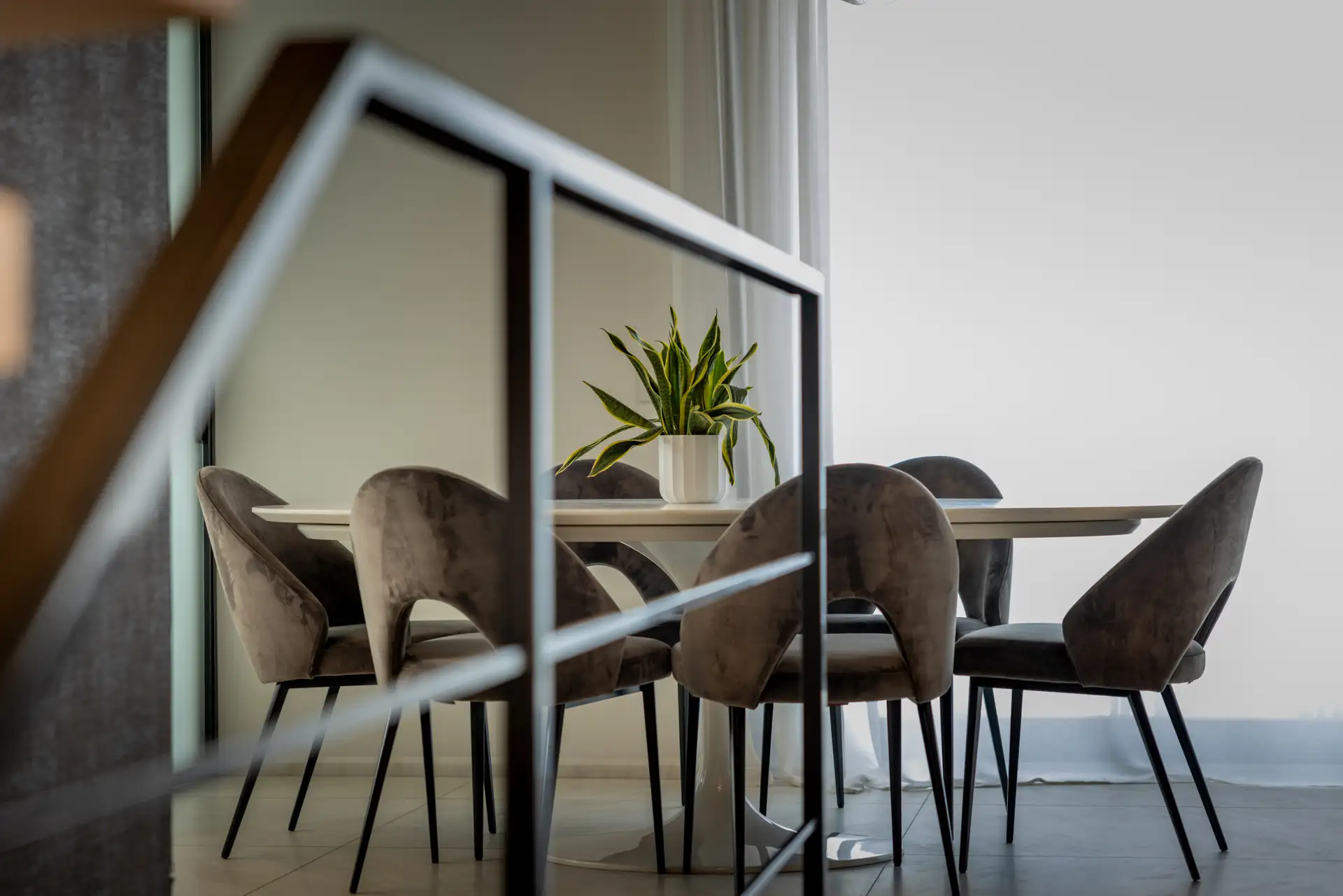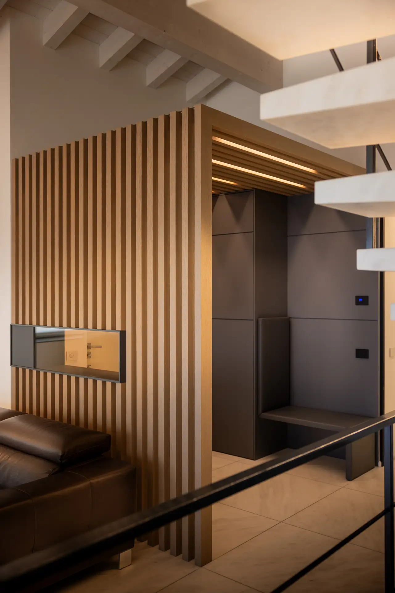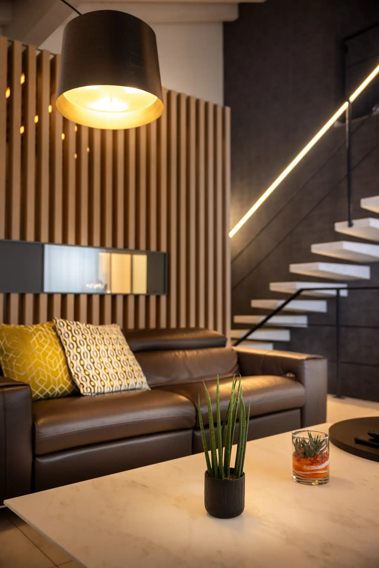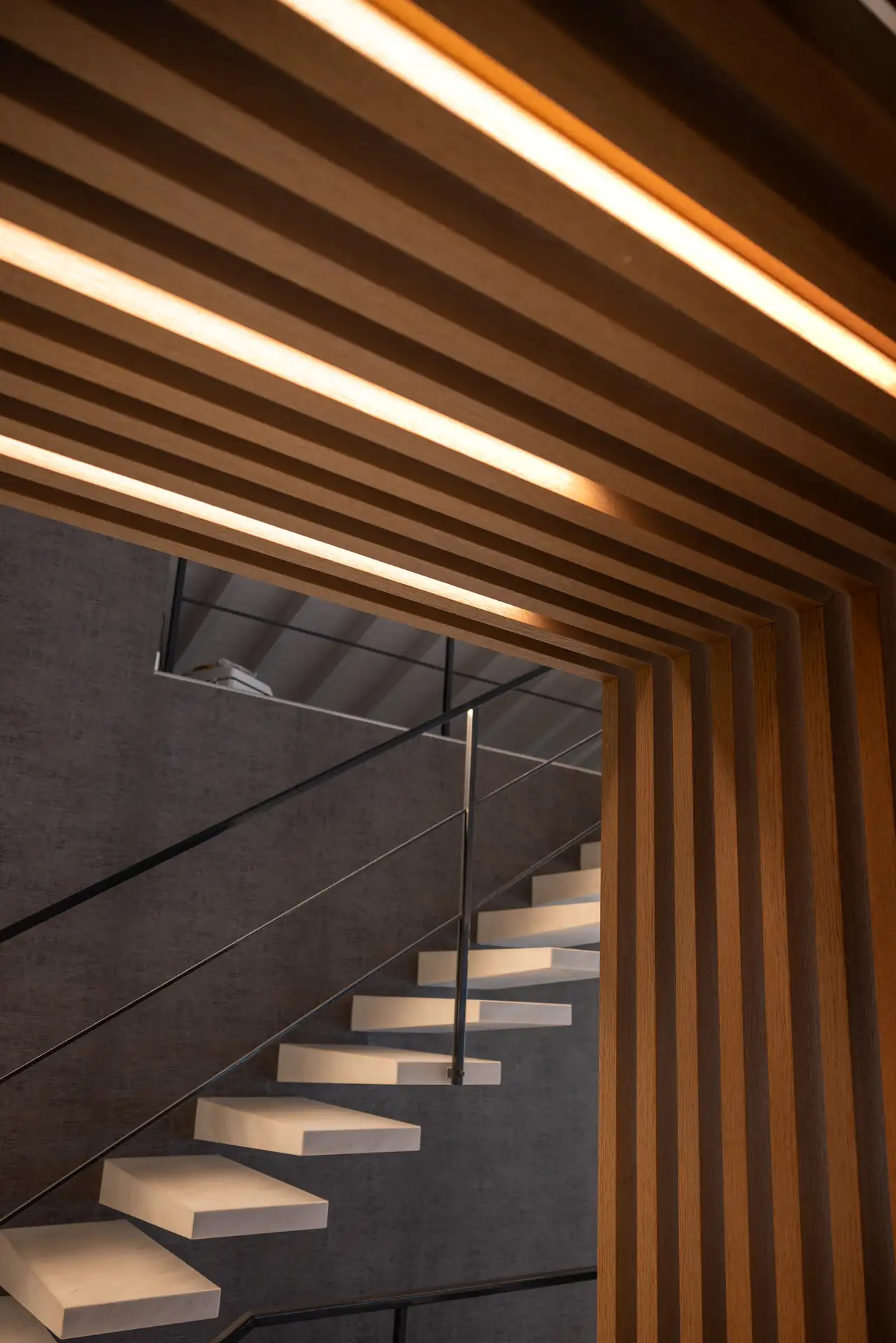 La scala minimalista collega zona giorno e zona notte, con gradini sospesi in marmo dal taglio asimmetrico e un corrimano in ferro impreziosito da luci LED che sottolineano il disegno architettonico.