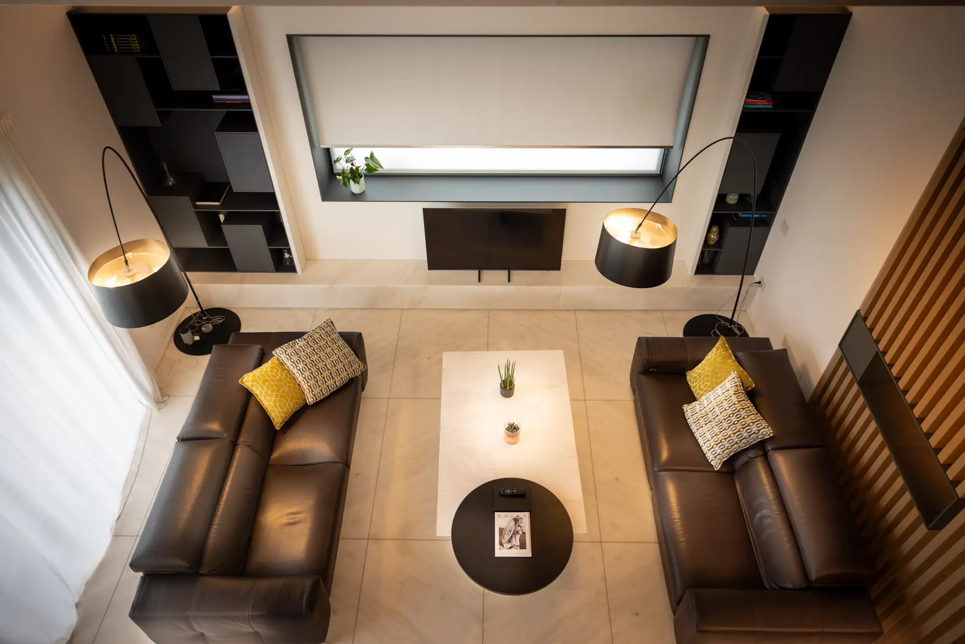 Una grande porta vetrata scorrevole permette di separare la cucina dal living, senza interrompere la continuità visiva. In soggiorno, il protagonista è il marmo, che si estende dal pavimento a rivestire il mobile TV, fino a ripresentarsi sul tavolino e sul top del tavolo ellittico, attorno al quale si dispongono sedie di design. L’essenzialità compositiva è esaltata dal mobile libreria, scandito da un ritmo equilibrato di pieni e vuoti. Sospeso sopra il tavolo, il grande lampadario dialoga con l’equilibrio dell’arredo, aggiungendo una nota di sofisticata particolarità che racconta il carattere dei proprietari.