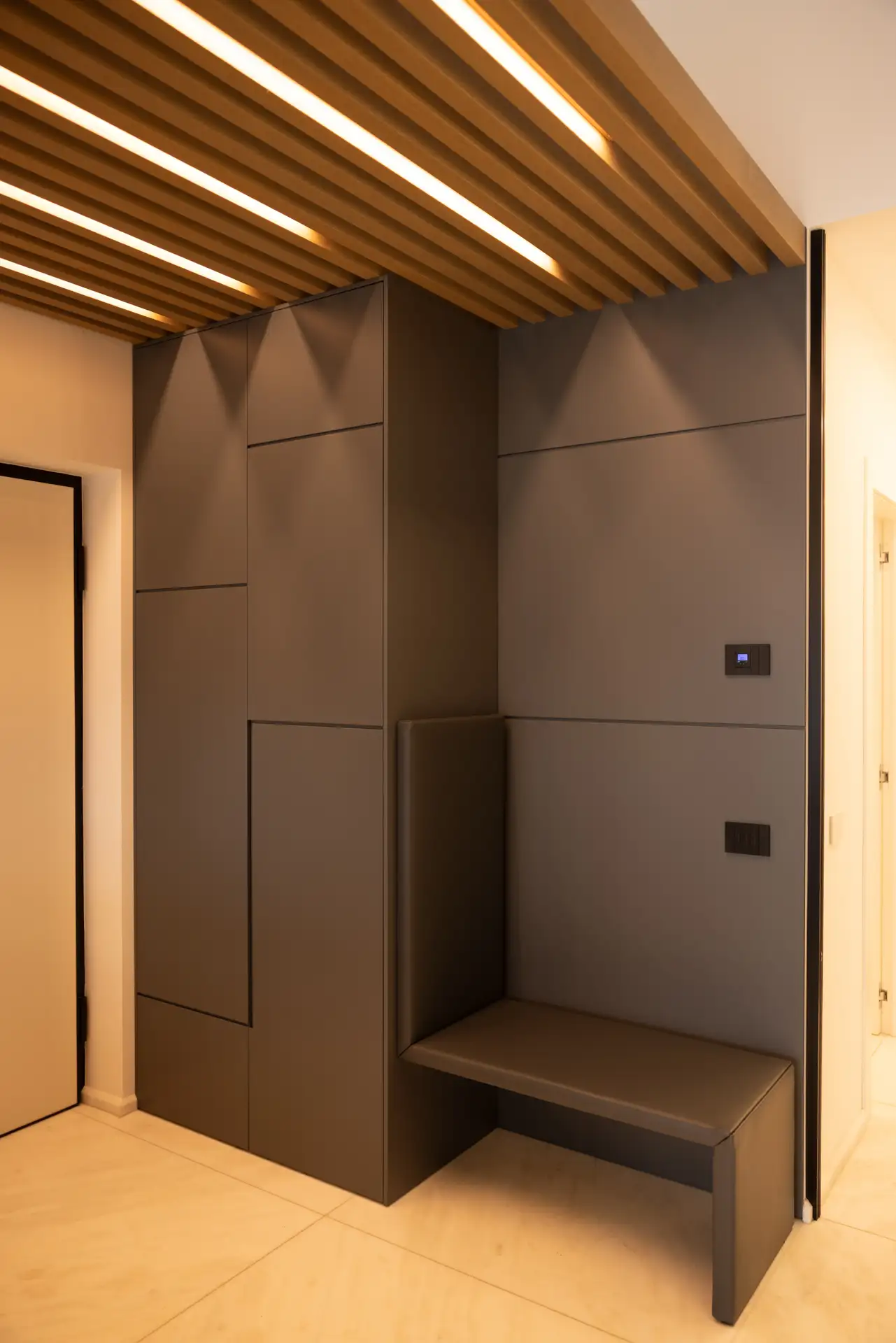 L’ingresso è incorniciato da montanti in rovere con led incastonati e una nicchia a sbalzo, che introducono con discreta teatralità l’atmosfera della casa. Il mobile spogliatoio e la panca, progettati con geometrica precisione, interpretano il concetto di accoglienza in chiave contemporanea.