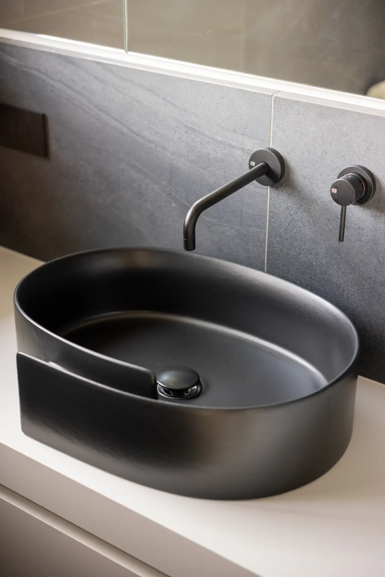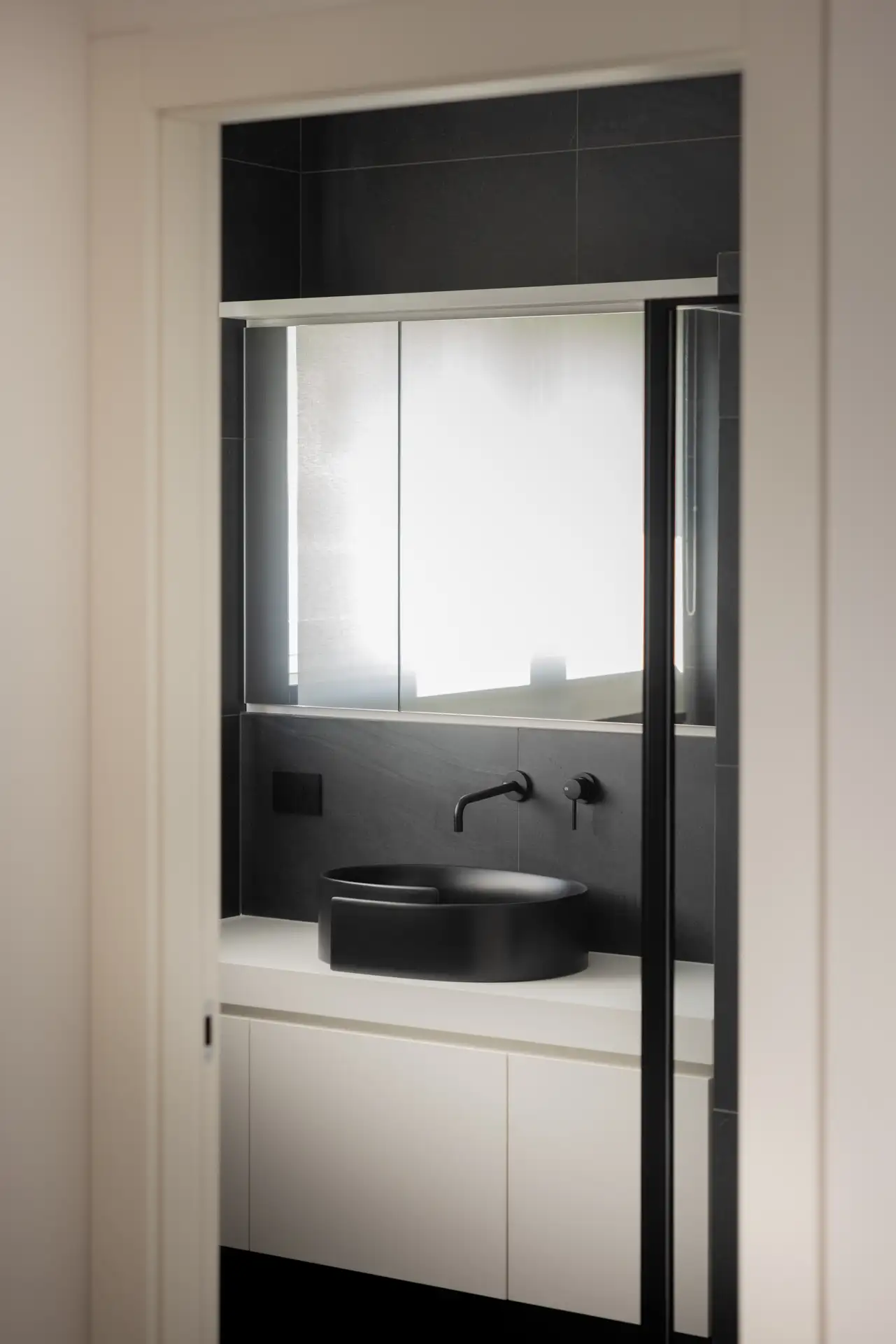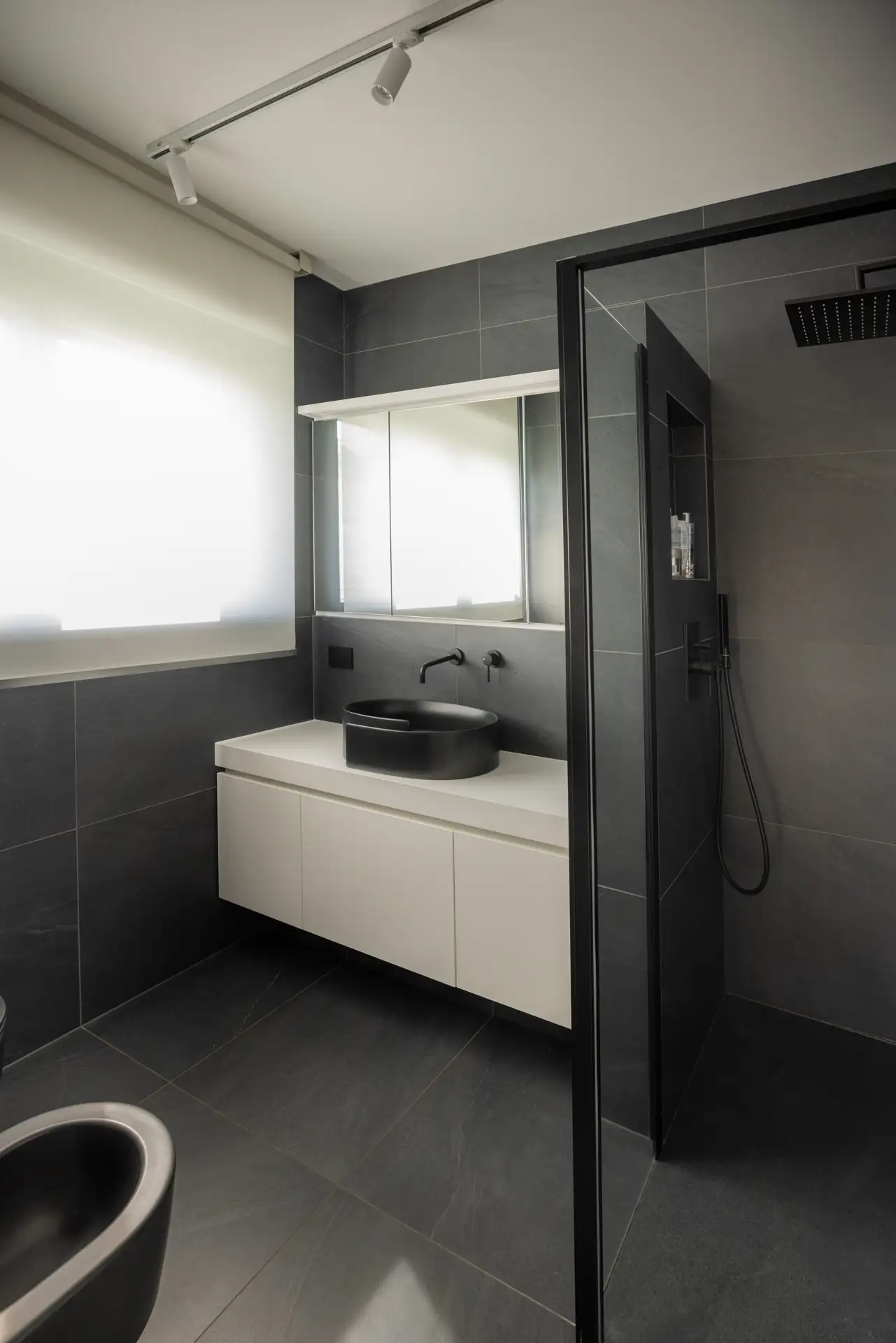 Anche nella zona notte e nei servizi si ritrova il medesimo linguaggio progettuale pulito e funzionale. I mobili lavabo dalle linee essenziali, insieme alla predominanza di bianco e grigio, rafforzano l’idea di uno spazio elegante e rilassante. I sanitari neri interpretano le tendenze attuali con carattere, mentre il lavabo del bagno padronale rappresenta un dettaglio di raffinata personalizzazione.