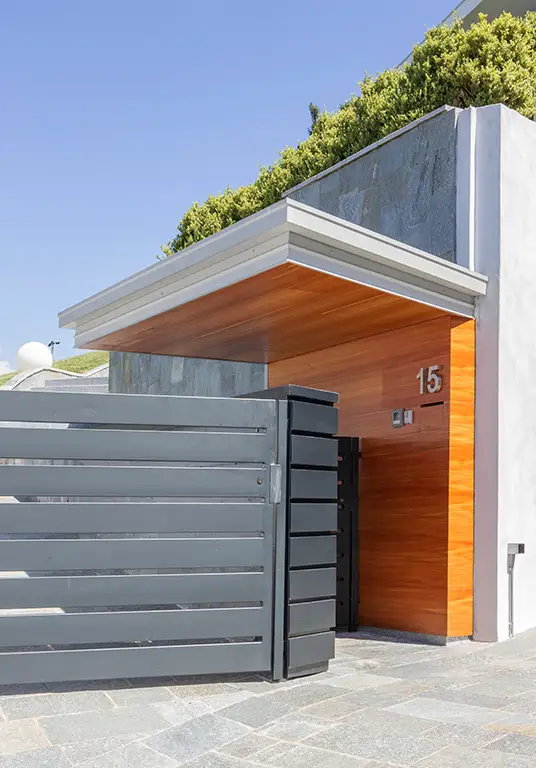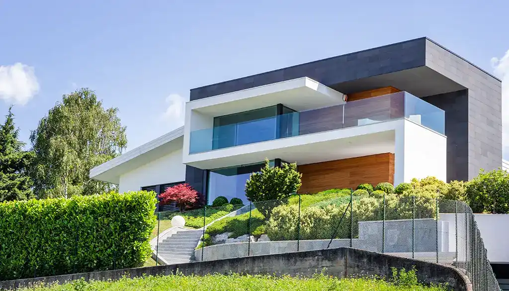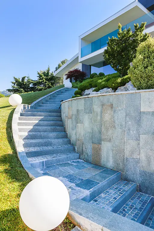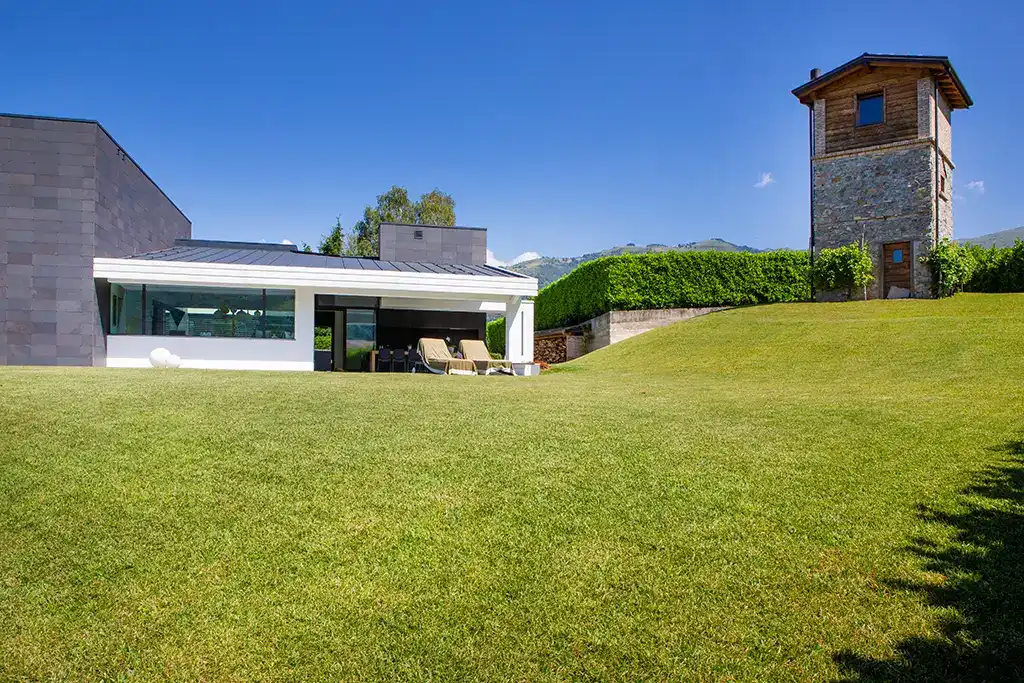 Per quanto riguarda gli esterni, ci siamo occupati della progettazione completa, dando forma linee moderne e volumi geometrici che definiscono una composizione dinamica e scultorea. Le facciate si articolano come una scacchiera tridimensionale, caratterizzata da un equilibrio dinamico tra pieni e vuoti. I materiali scelti – legno naturale e pietra – si susseguono e si integrano con ritmo e coerenza, creando un contrasto materico che conferisce prestigio e solidità all’intero impianto architettonico e restituisce equilibrio e integrazione con il paesaggio naturale.