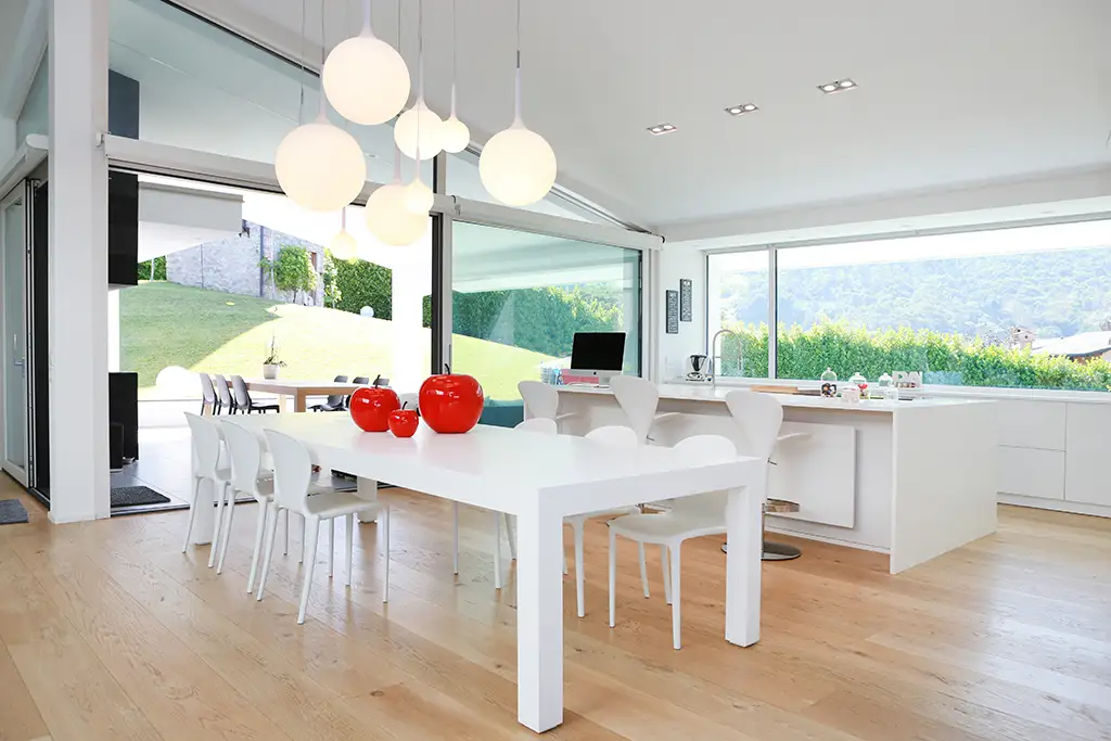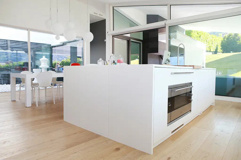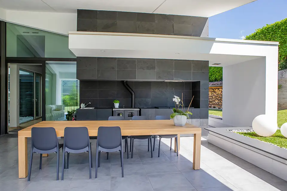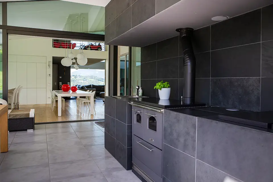 All’interno, la luce naturale è protagonista: ampie vetrate aprono lo spazio verso il grande giardino e le montagne circostanti, creando un rapporto diretto con l’ambiente esterno e consentendo l’accesso alla cucina all’aperto, progettata come luogo conviviale per momenti di aggregazione e relax.