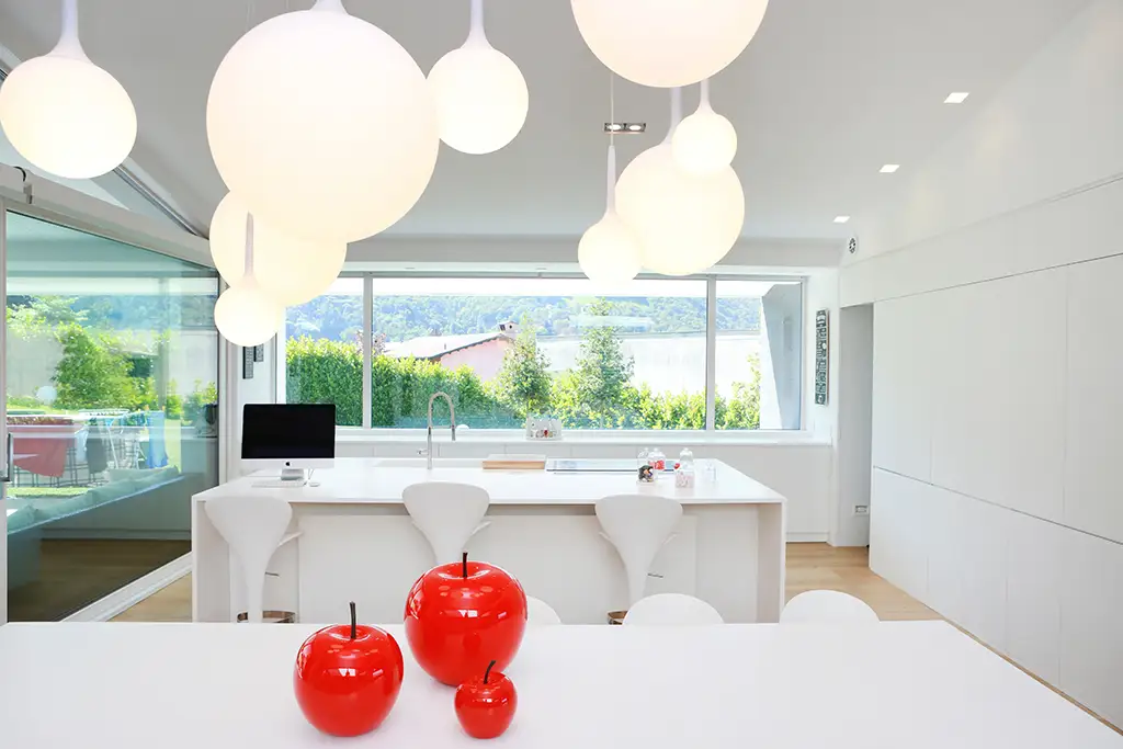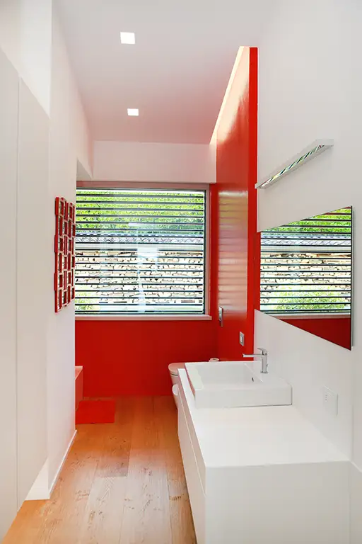 Ogni ambiente racconta la personalità dei proprietari: le sculture a scacchi monocromatiche poste nel patio interno, così come le tonalità rosso intenso di alcune pareti sono dettagli che aggiungono carattere e unicità, rendendo ogni spazio un’esperienza estetica e sensoriale su misura.