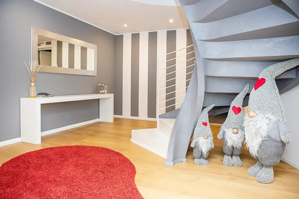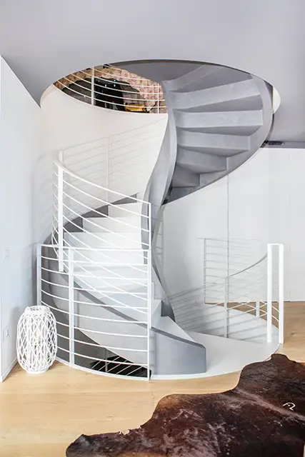 Una scala elicoidale dal disegno scultoreo collega i diversi livelli della casa, creando un suggestivo contrasto con la linearità rigorosa degli esterni. Gli interni sono definiti da un’estetica essenziale ma calda, dove il bianco e il legno chiaro del parquet dominano la scena, conferendo luminosità e armonia agli ambienti. Gli arredi, dal design minimale e funzionale, si integrano perfettamente nello spazio, mentre la cura dei dettagli riflette l’approccio sartoriale del progetto.